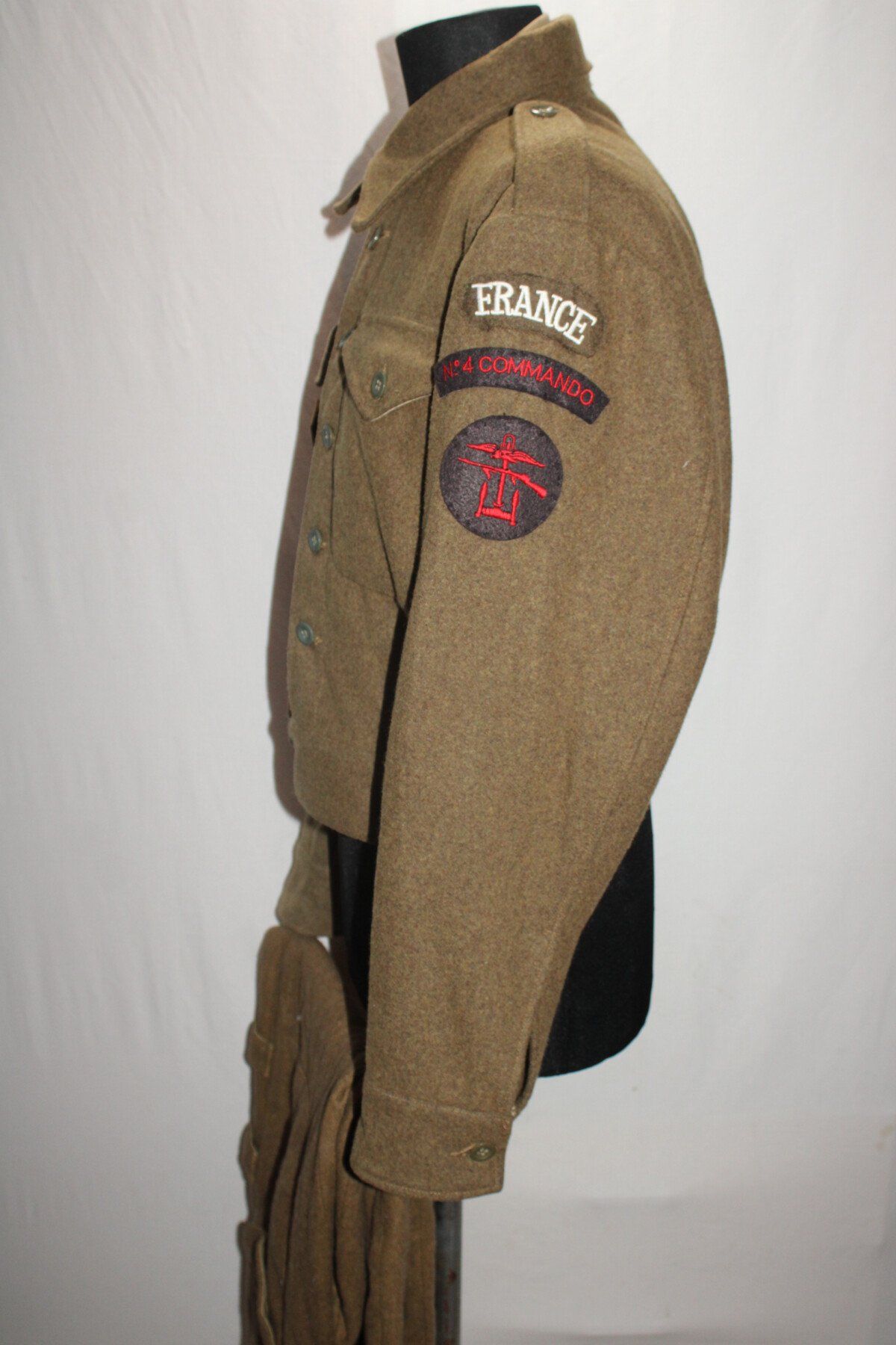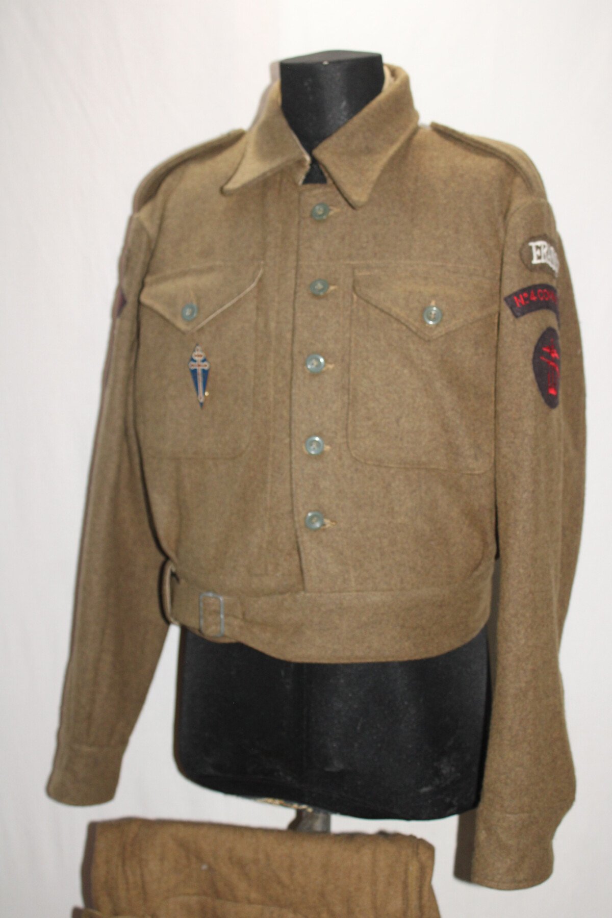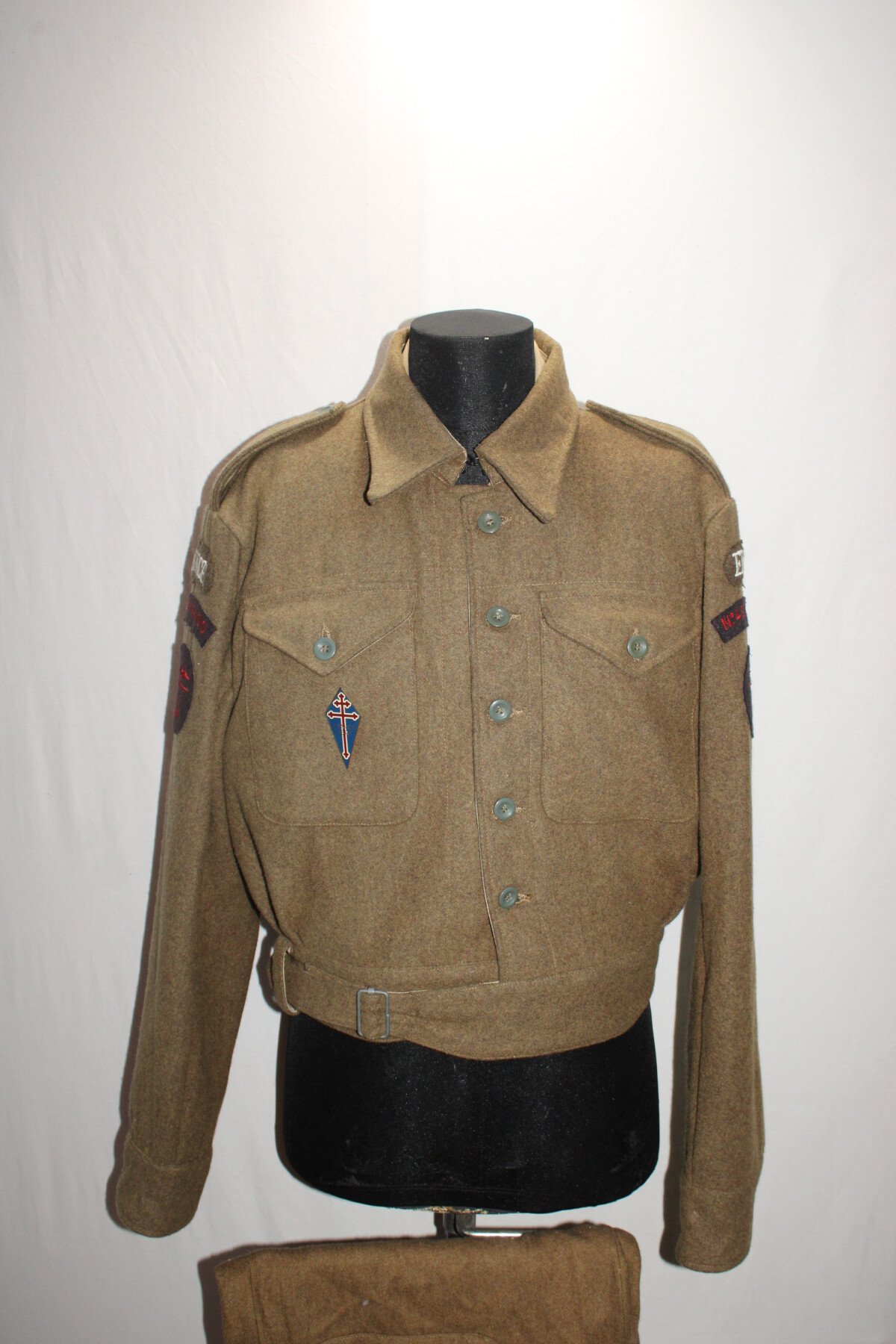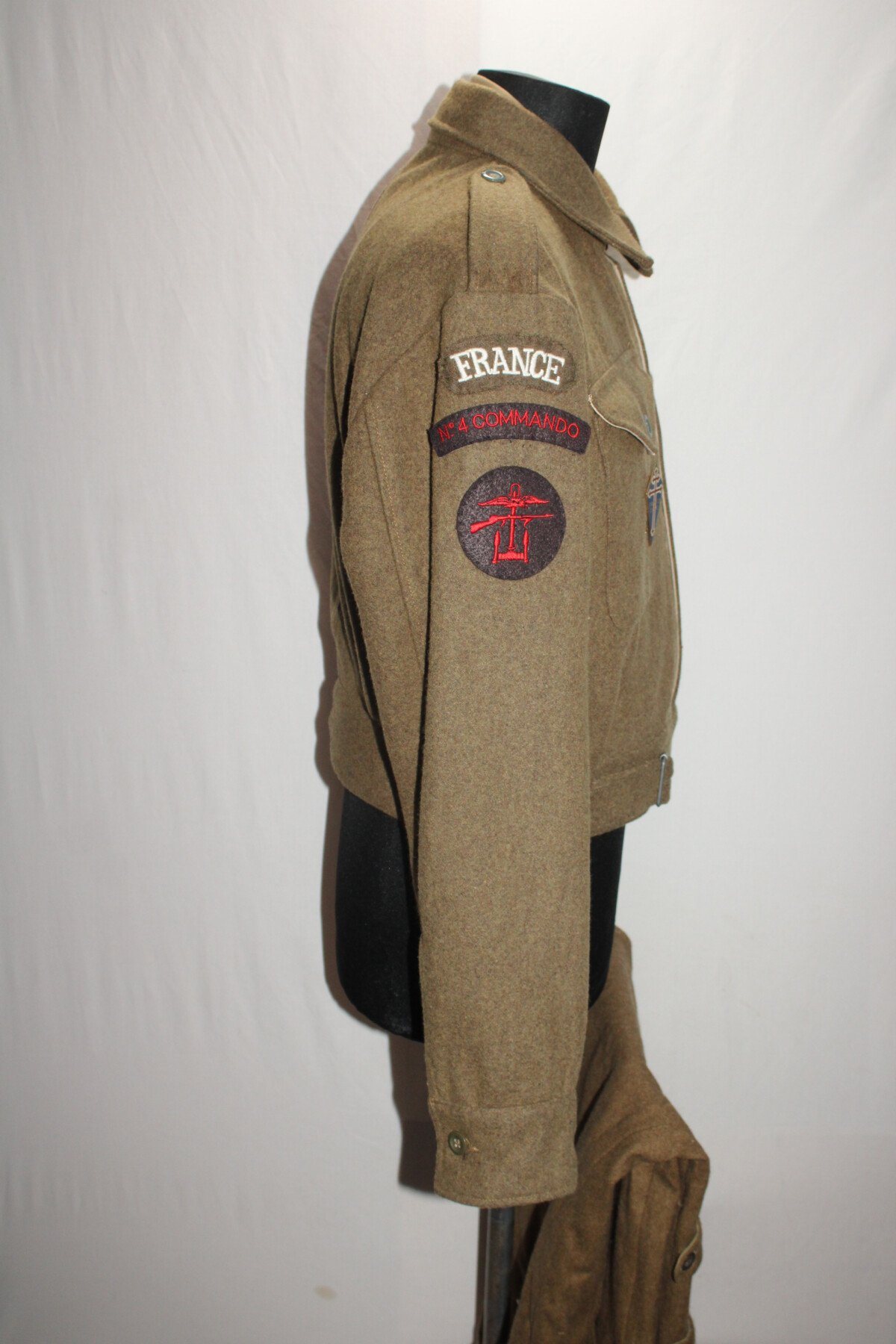 Fabrication en drap de laine du blouson de Battle Dress modèle 40 austérity monté en commando Kieffer. Insignes brodé. Blouson très peu porter et en très bon état général. Taille largeur...