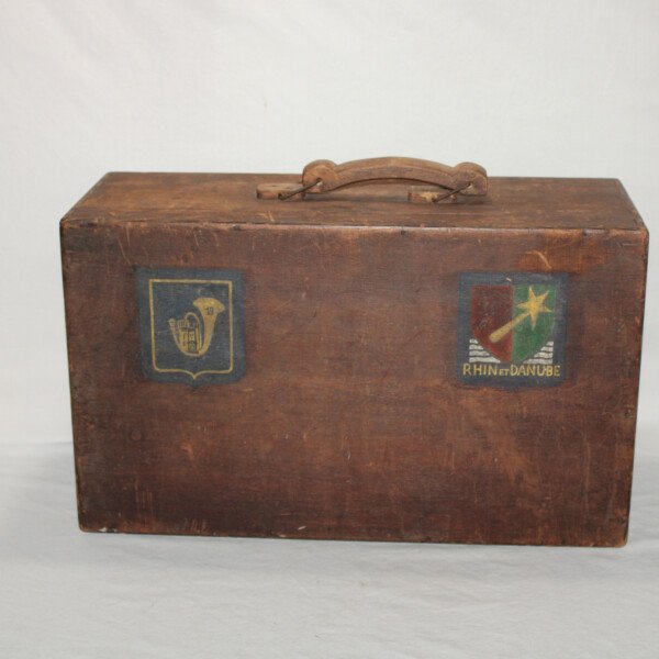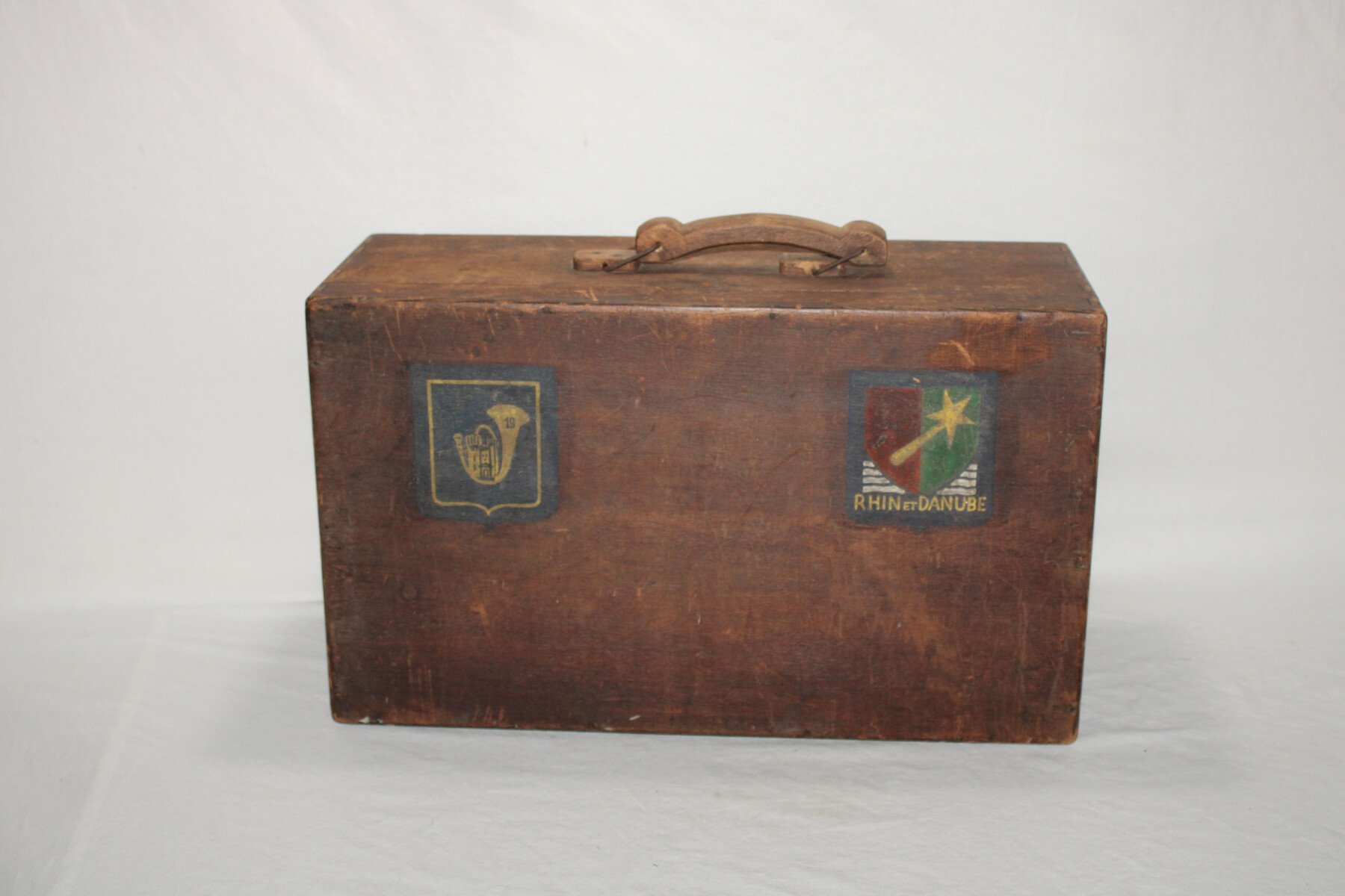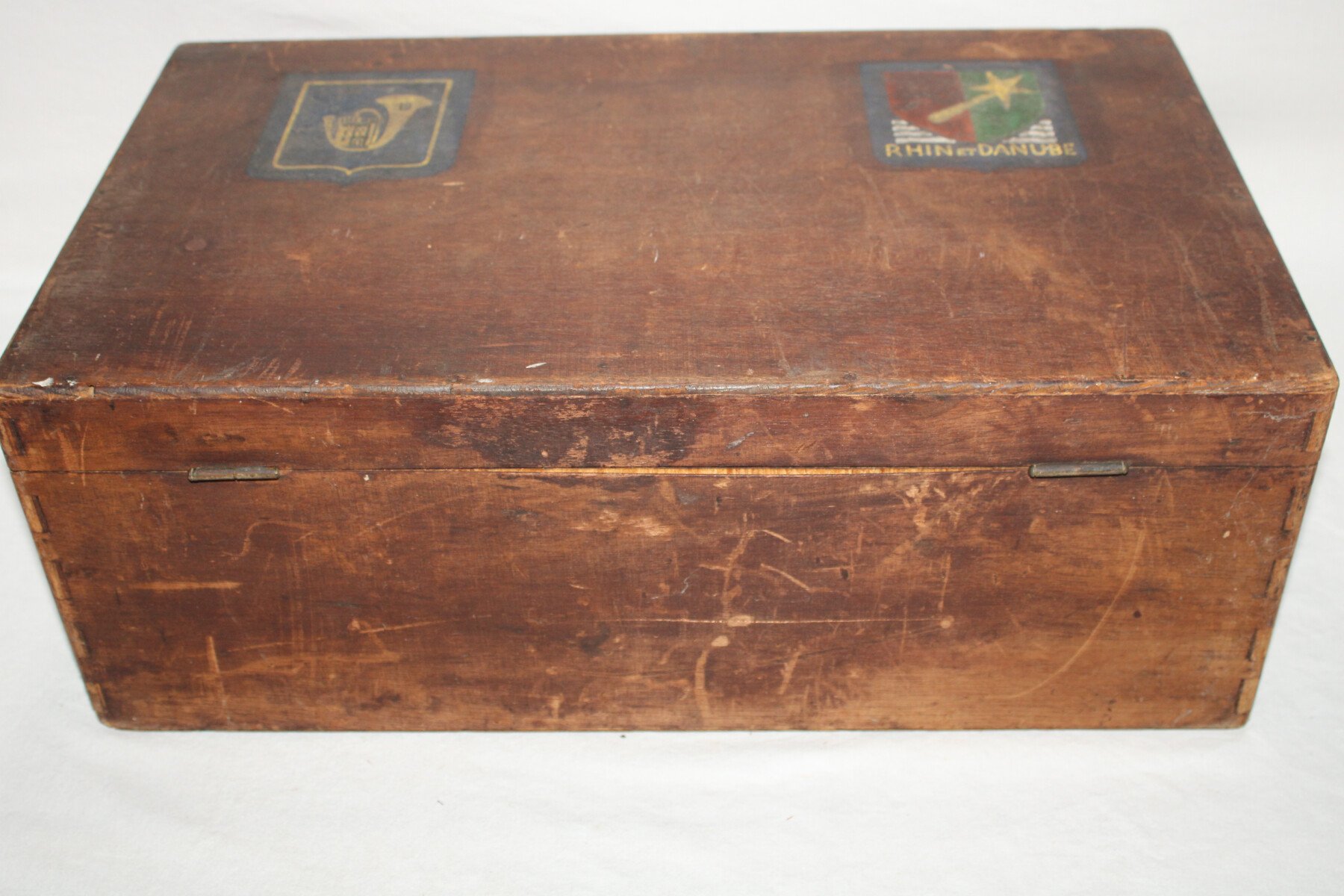 Valise en bois d'un chasseur du 19e bataillon de chasseur Porté. Insigne du 19e BCP et Rhin et Danube. Bois en bon état. Ne s'ouvre pas.