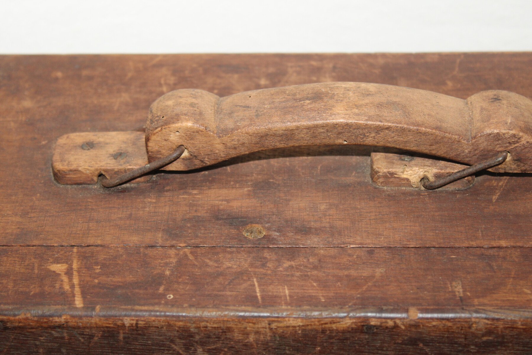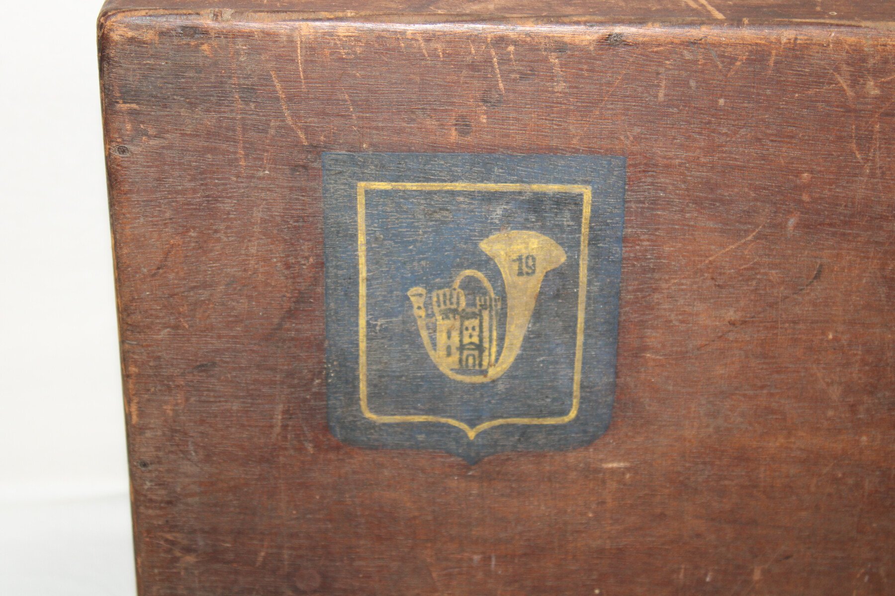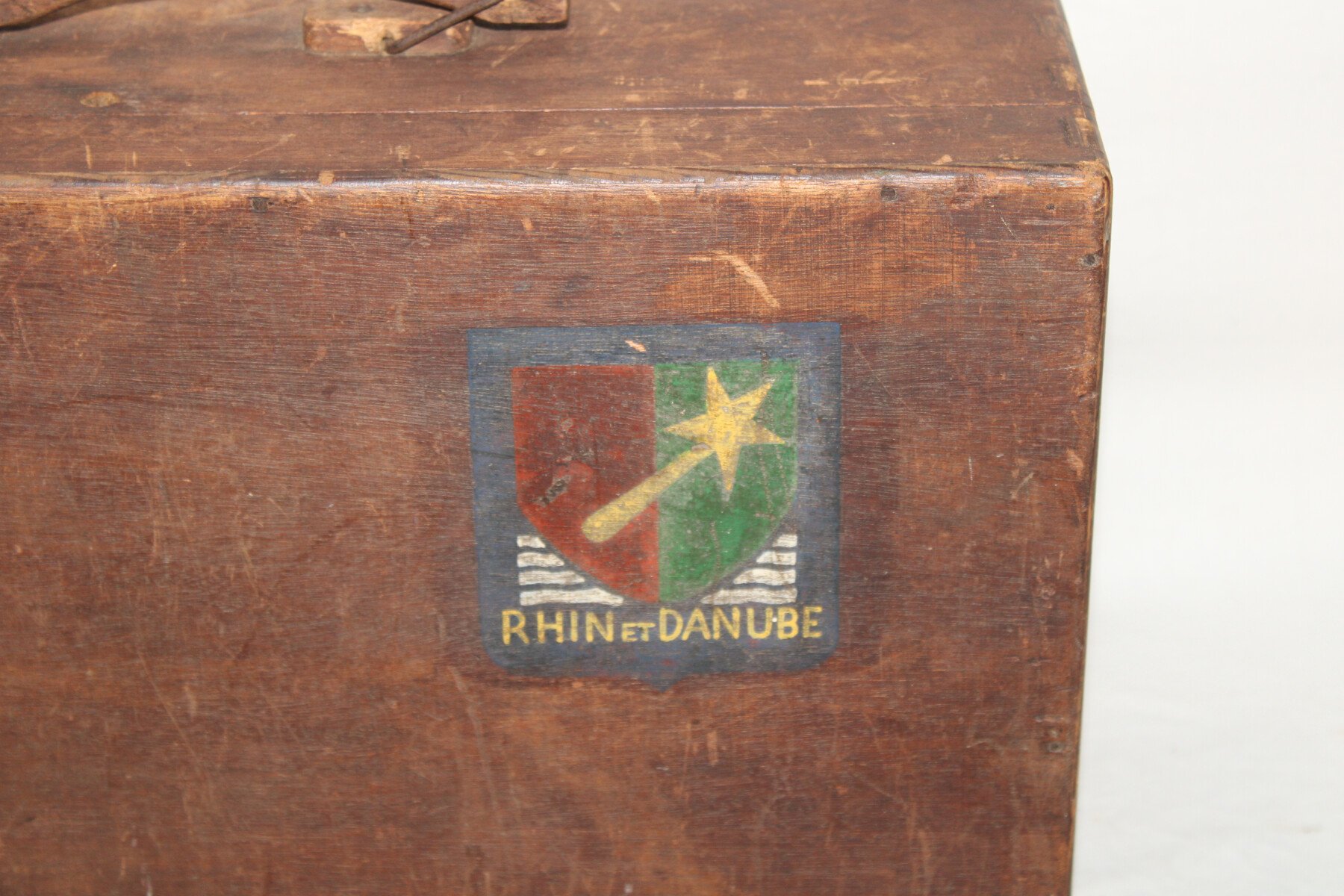 Valise en bois d'un chasseur du 19e bataillon de chasseur Porté. Insigne du 19e BCP et Rhin et Danube. Bois en bon état. Ne s'ouvre pas.