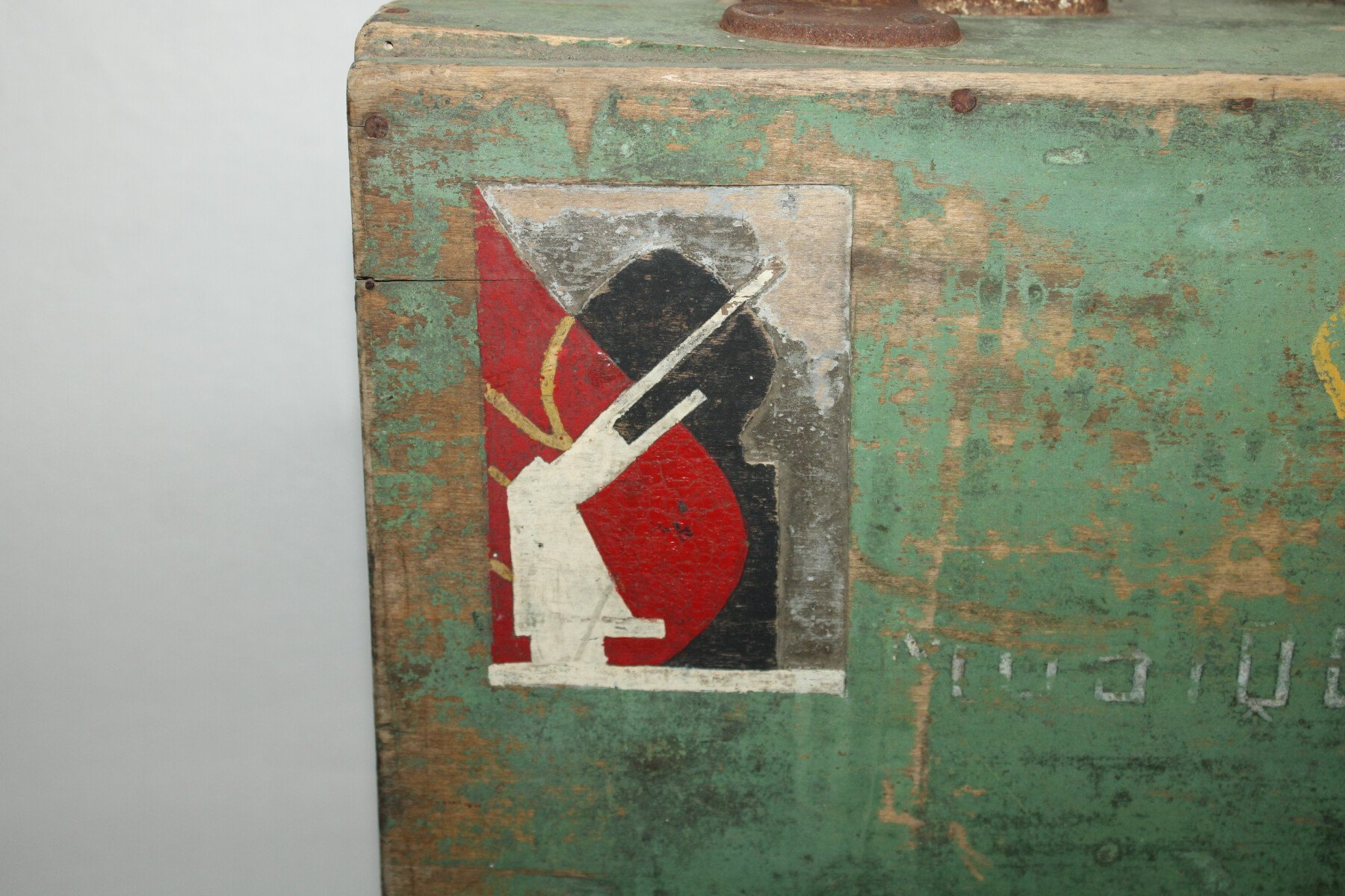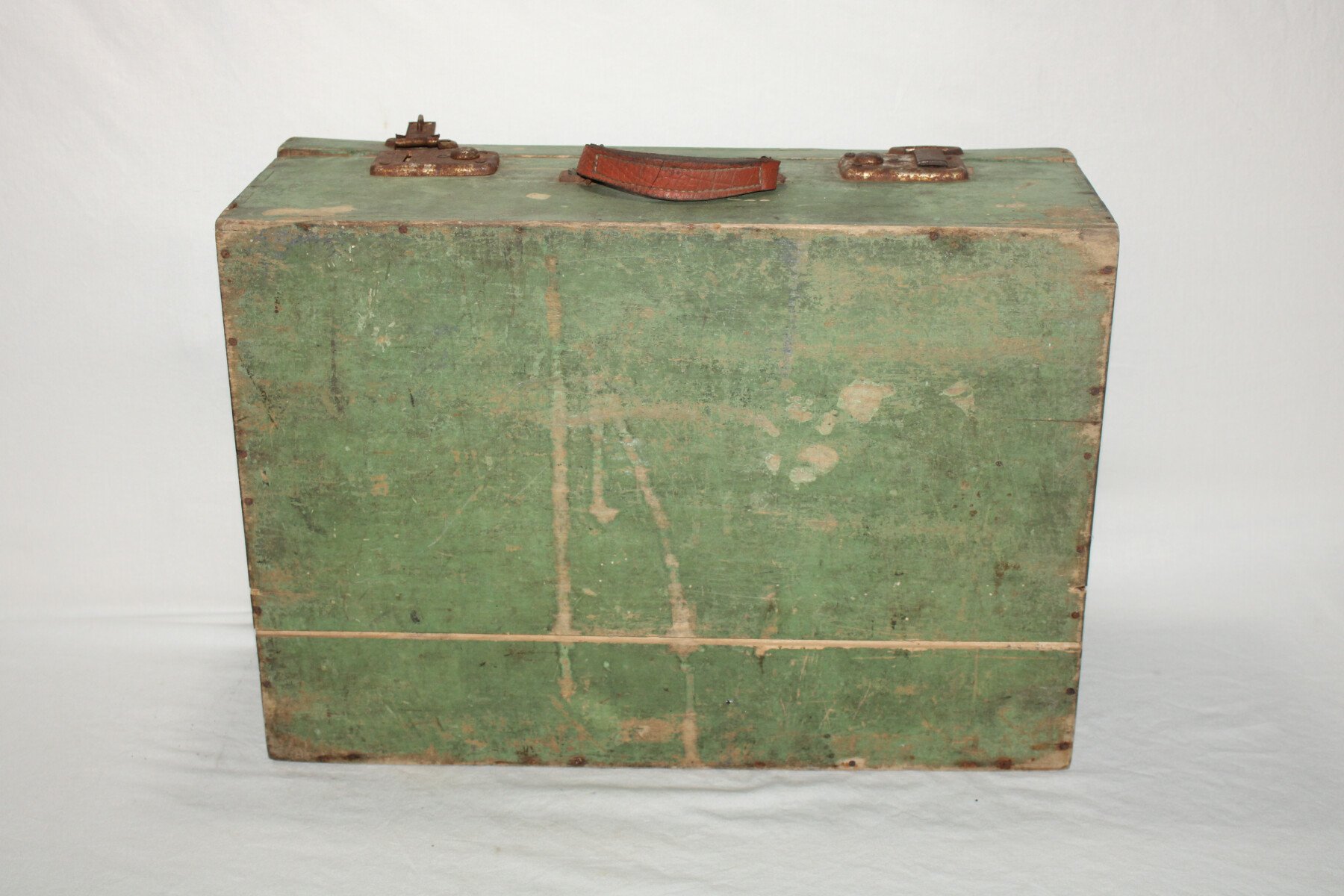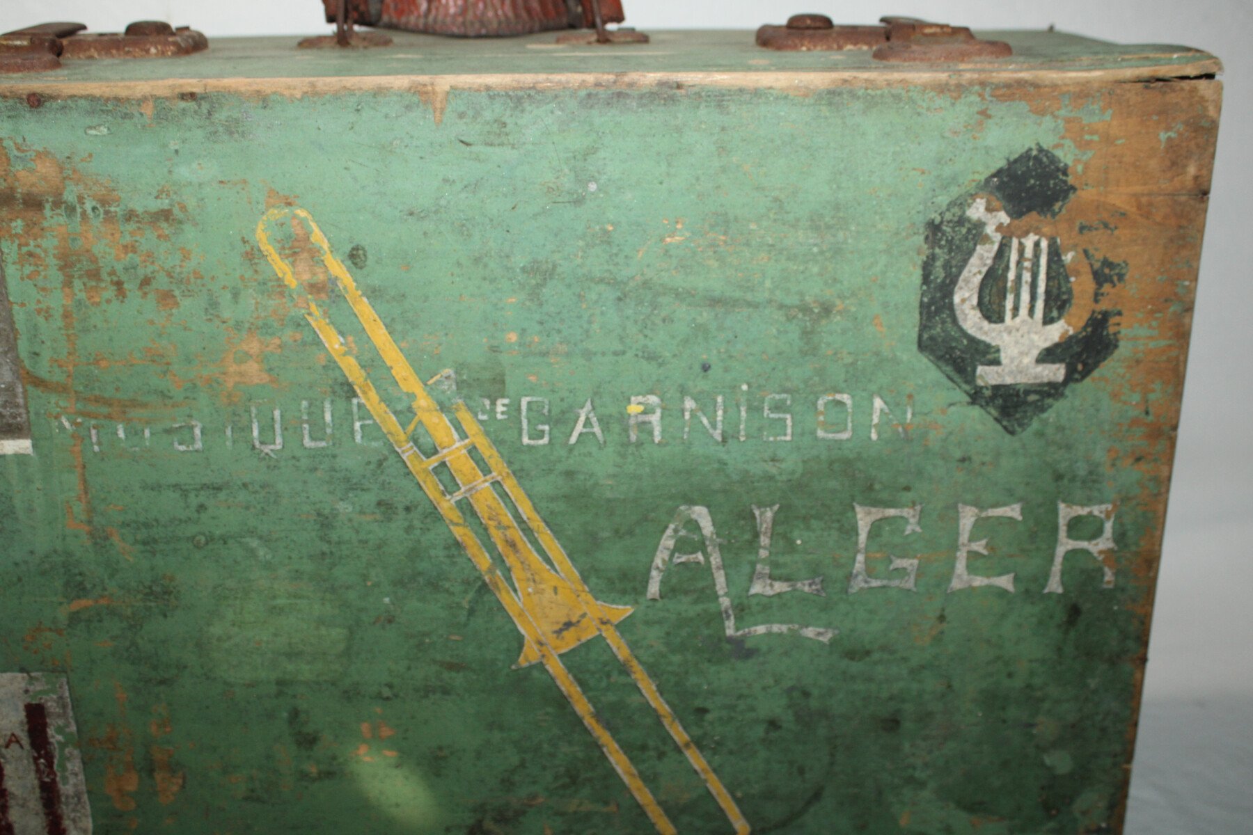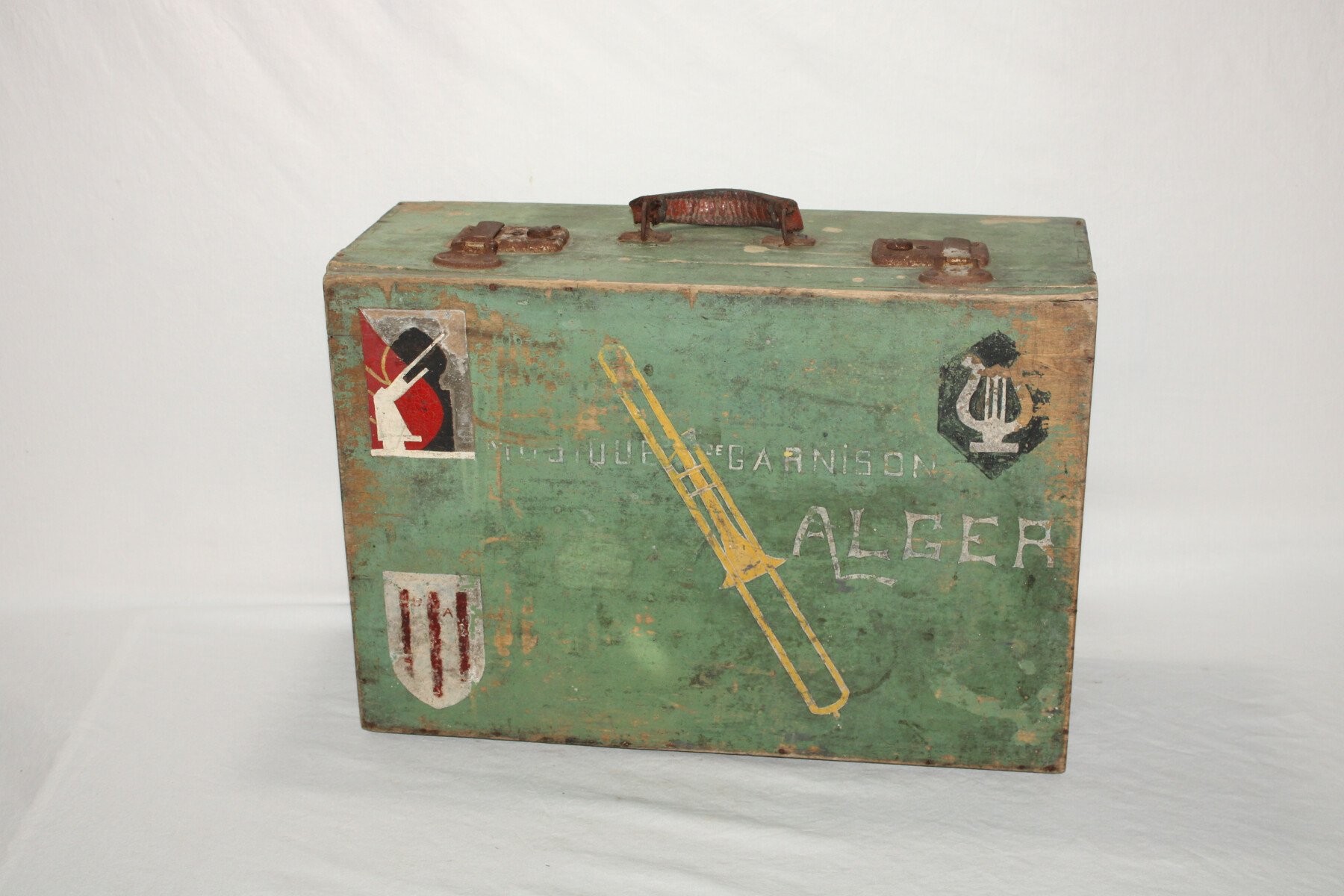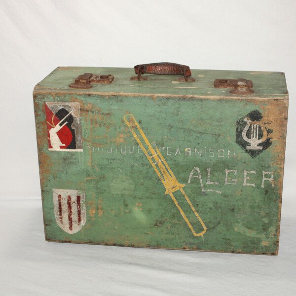 Valise en bois d'un musicien du 411e Régiment d'Artillerie Antiaérienne. Marquée musicien de garnison Alger, insigne du 411e RAA, manque la partie blanche .Poignet en cuir cassée sur un coté....