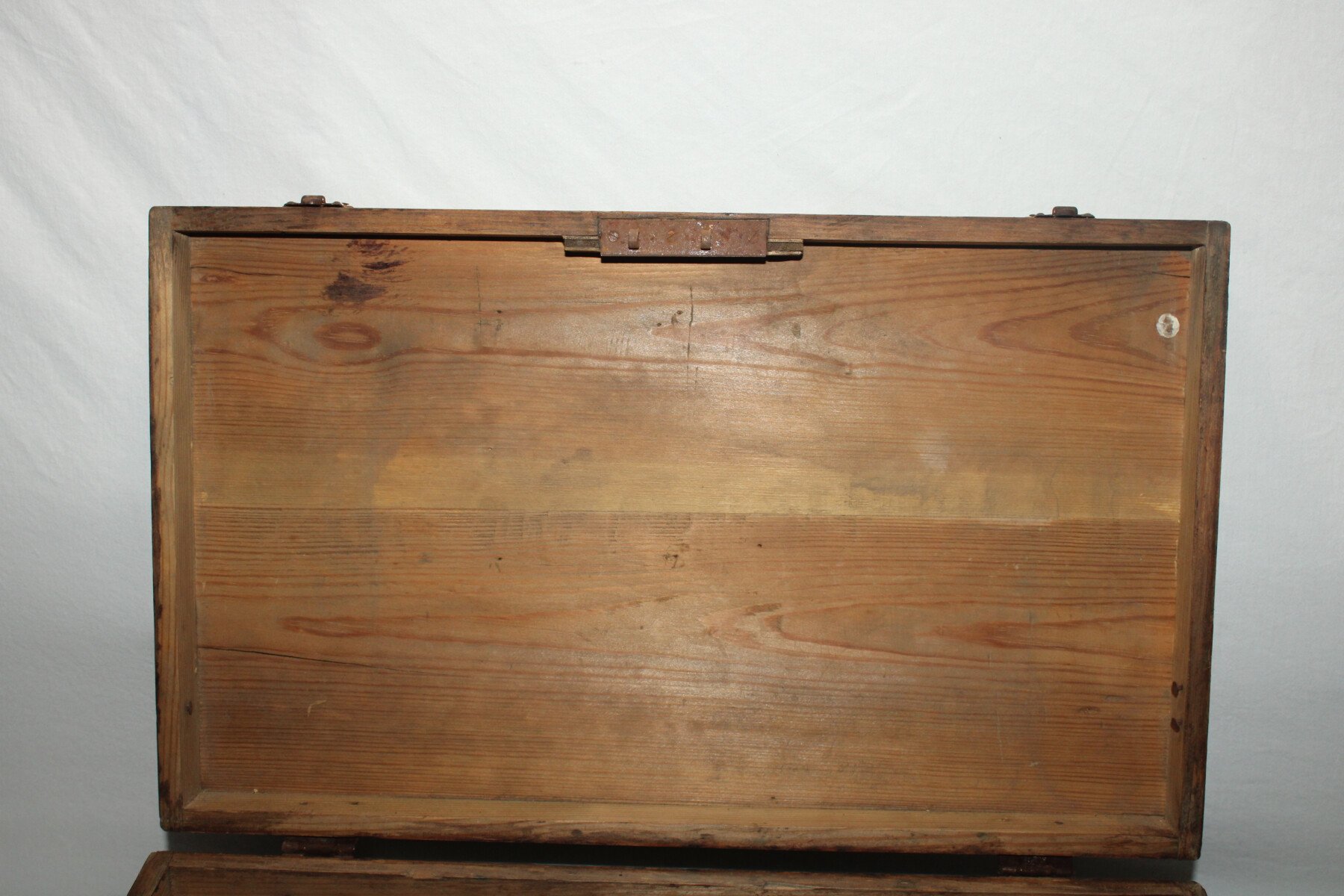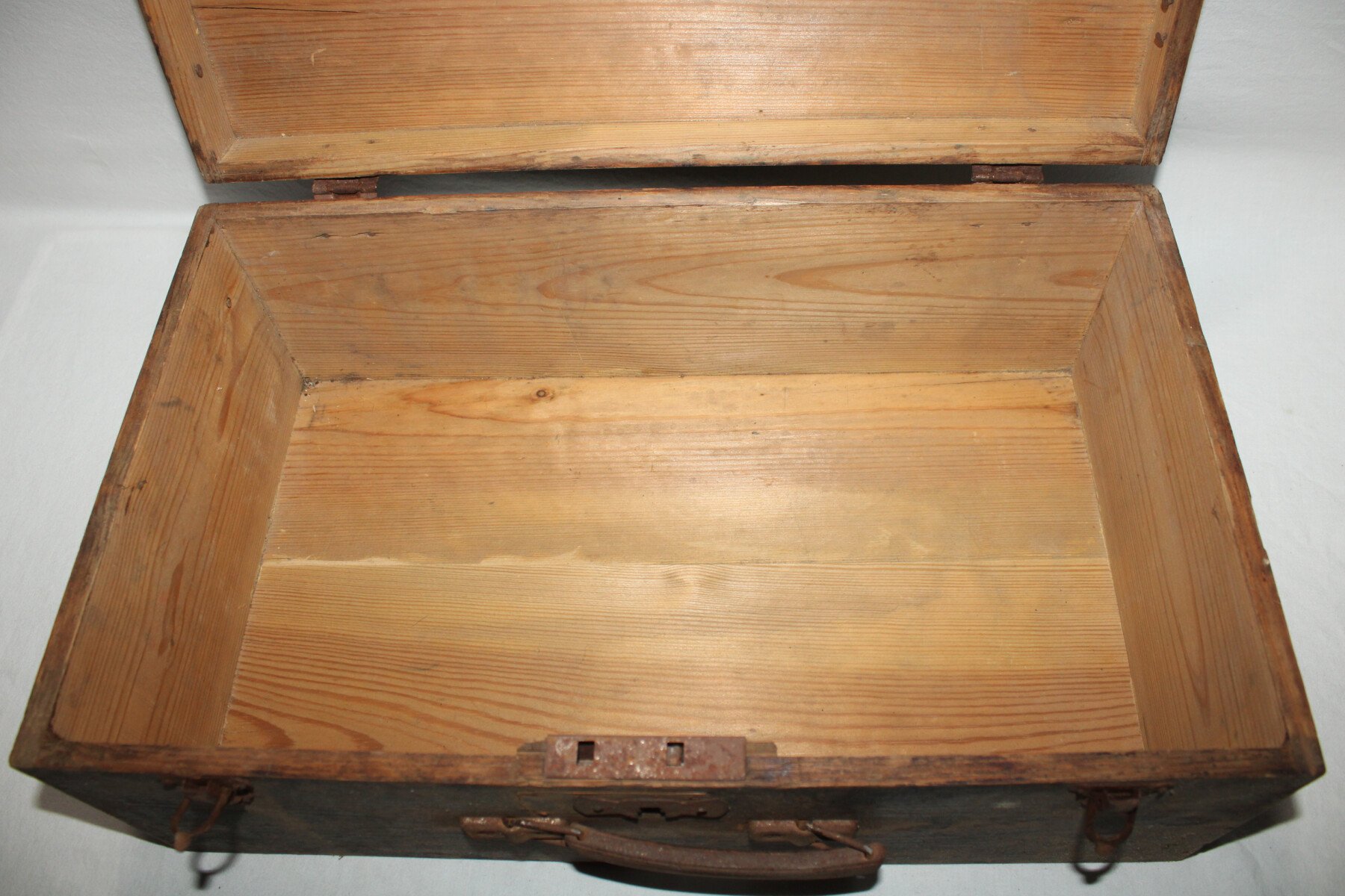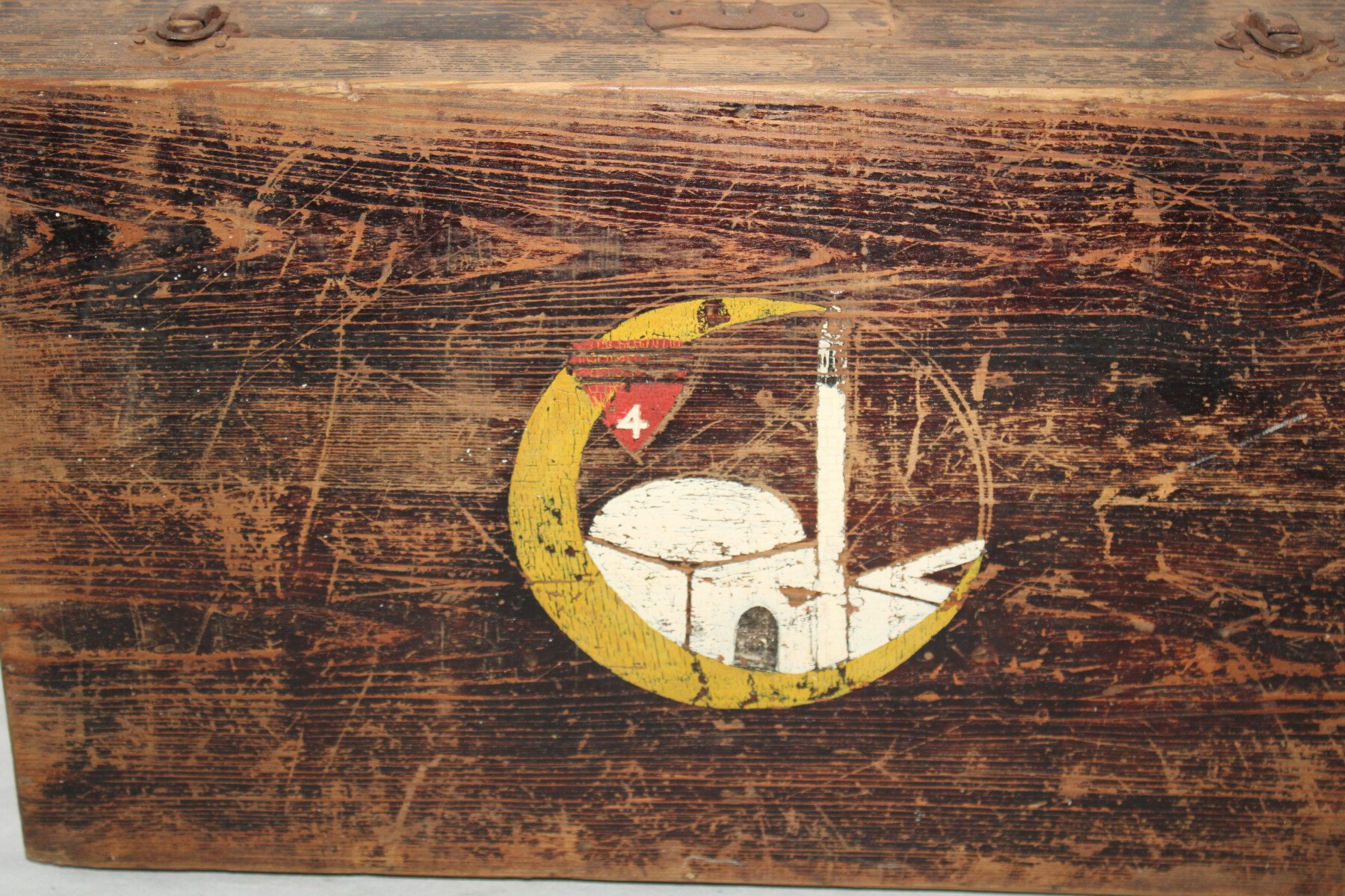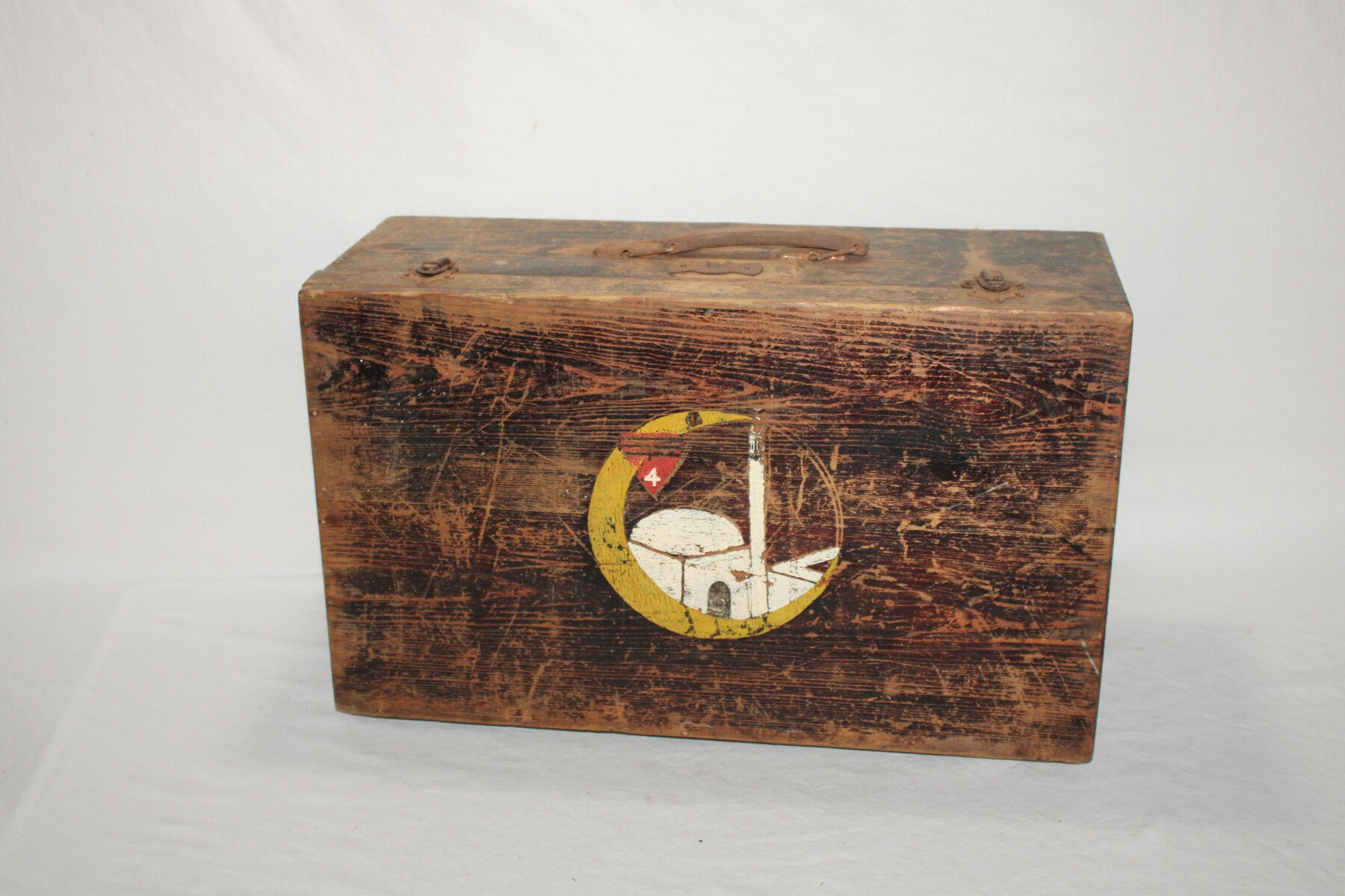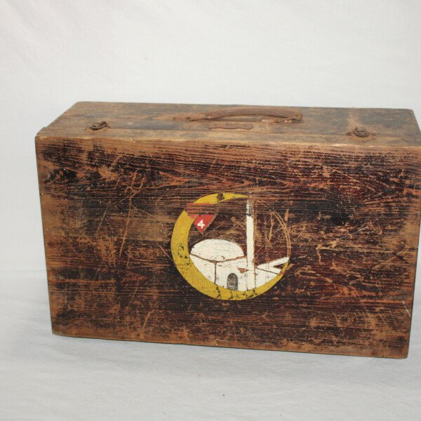 Valise en bois d'un soldat du 4e Régiment de chasseur d'Afrique.  Insigne peint. Poignet présente. Bois en bon état. Un loquet ferme mal.
