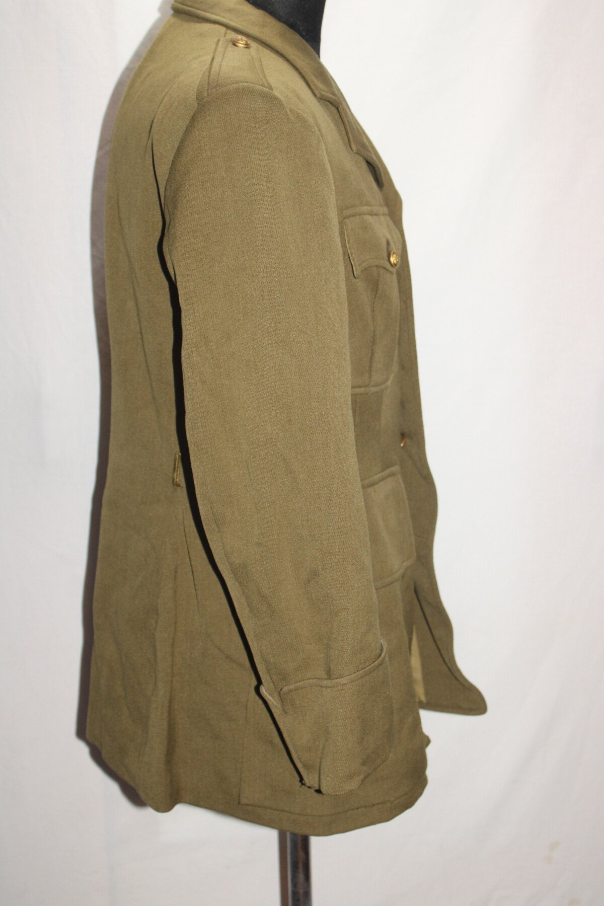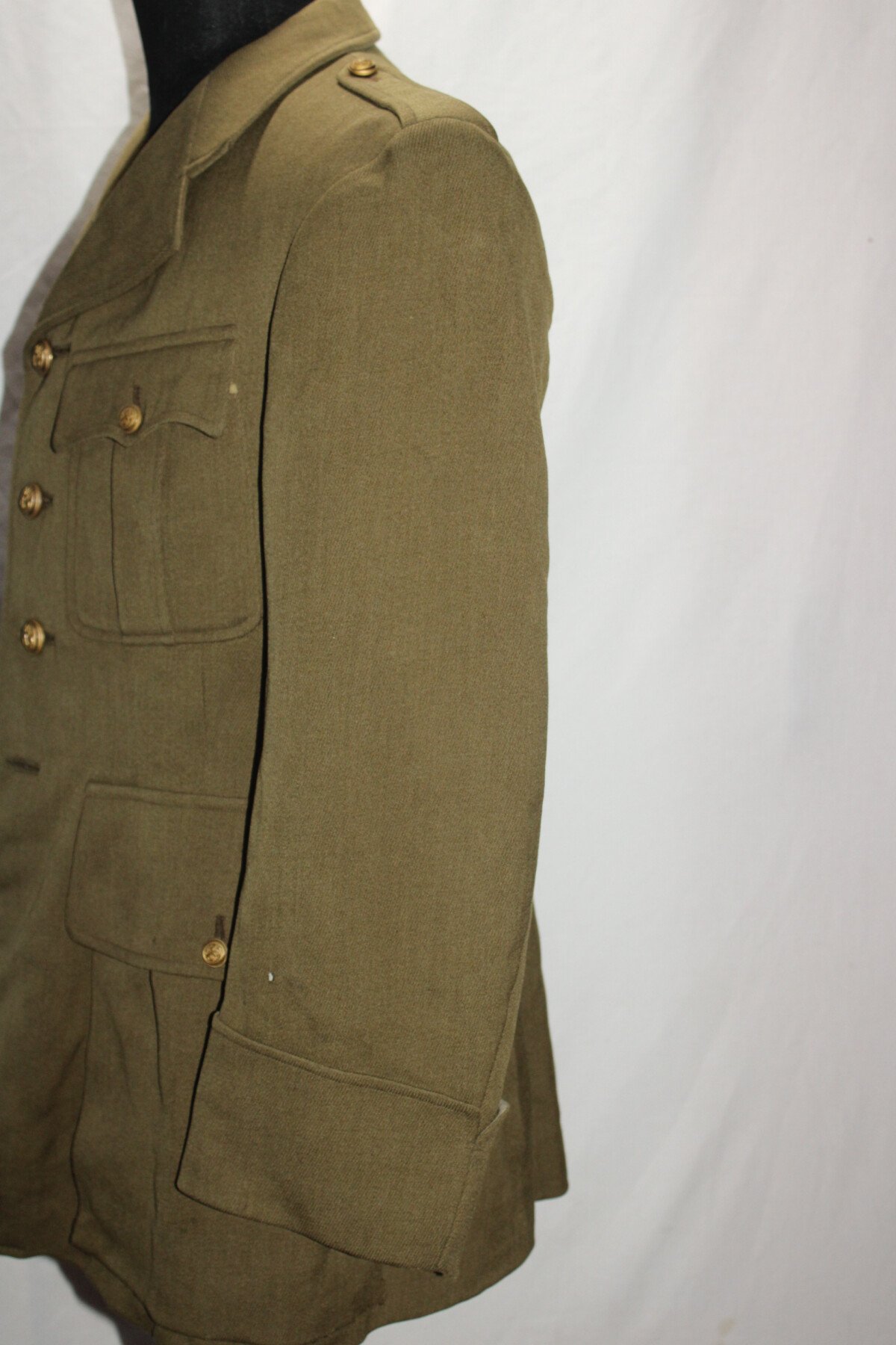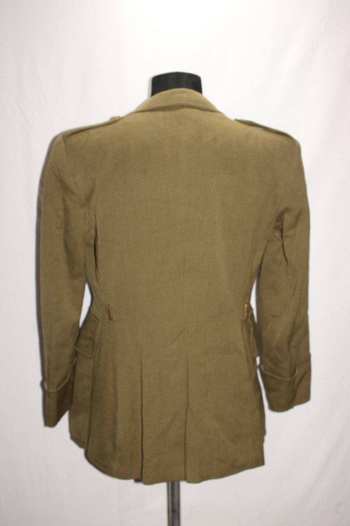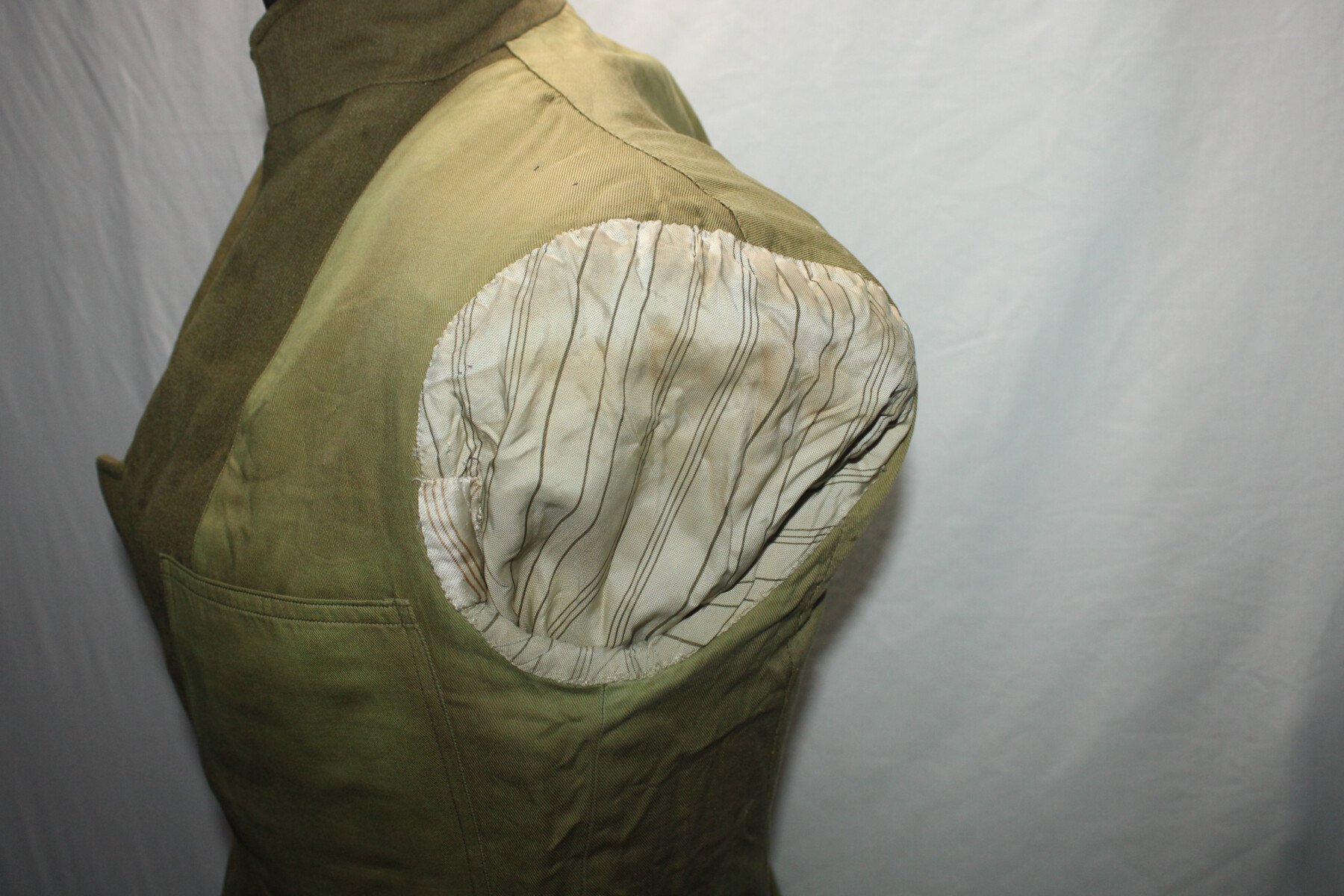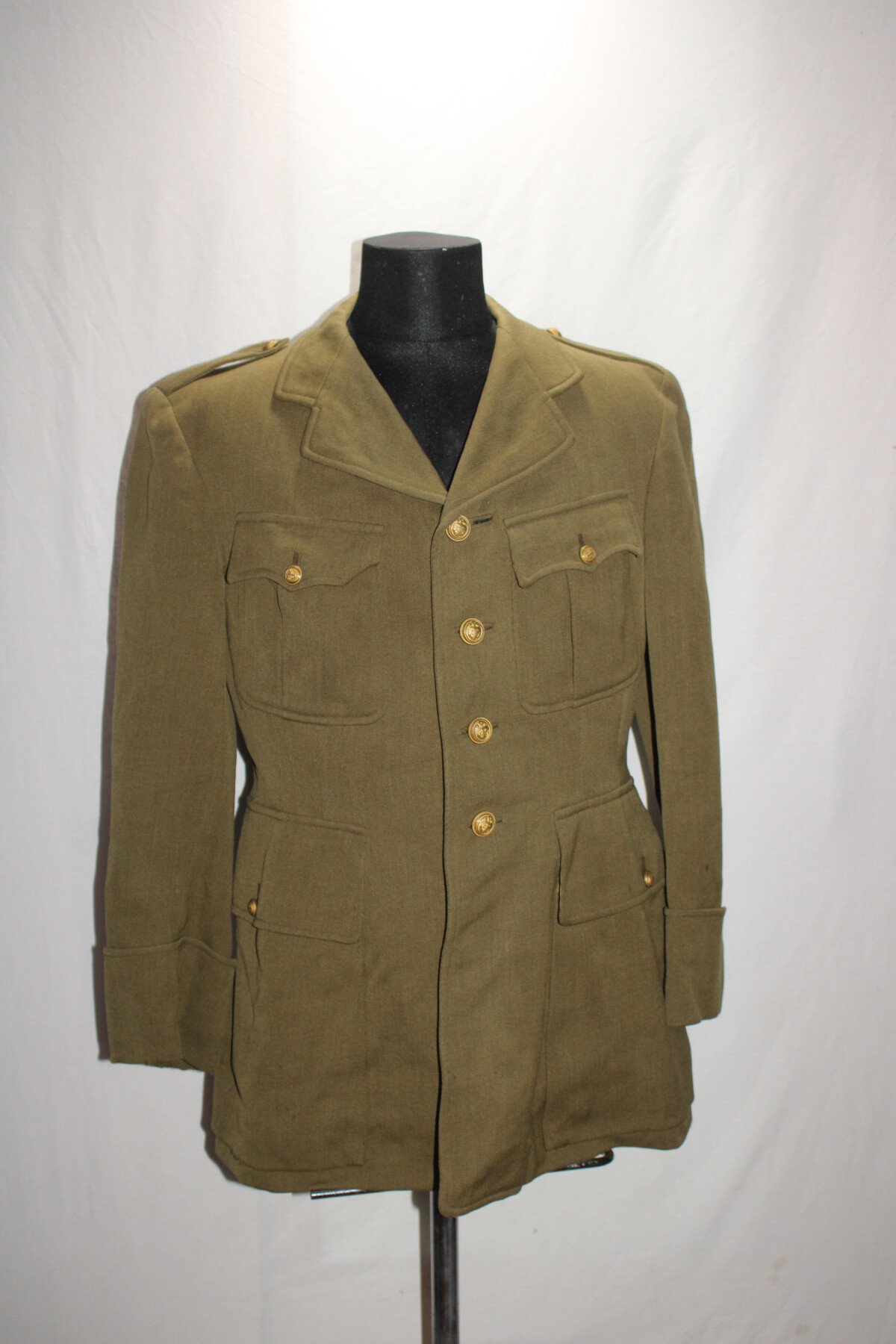 Vareuse modèle 39 pour officier, boutons d'armes aux couleurs de la Coloniale. Trous sur le bas des poches. Taille: largeur d'épaules 46cm à plat. Longueur de manche: 58 cm.