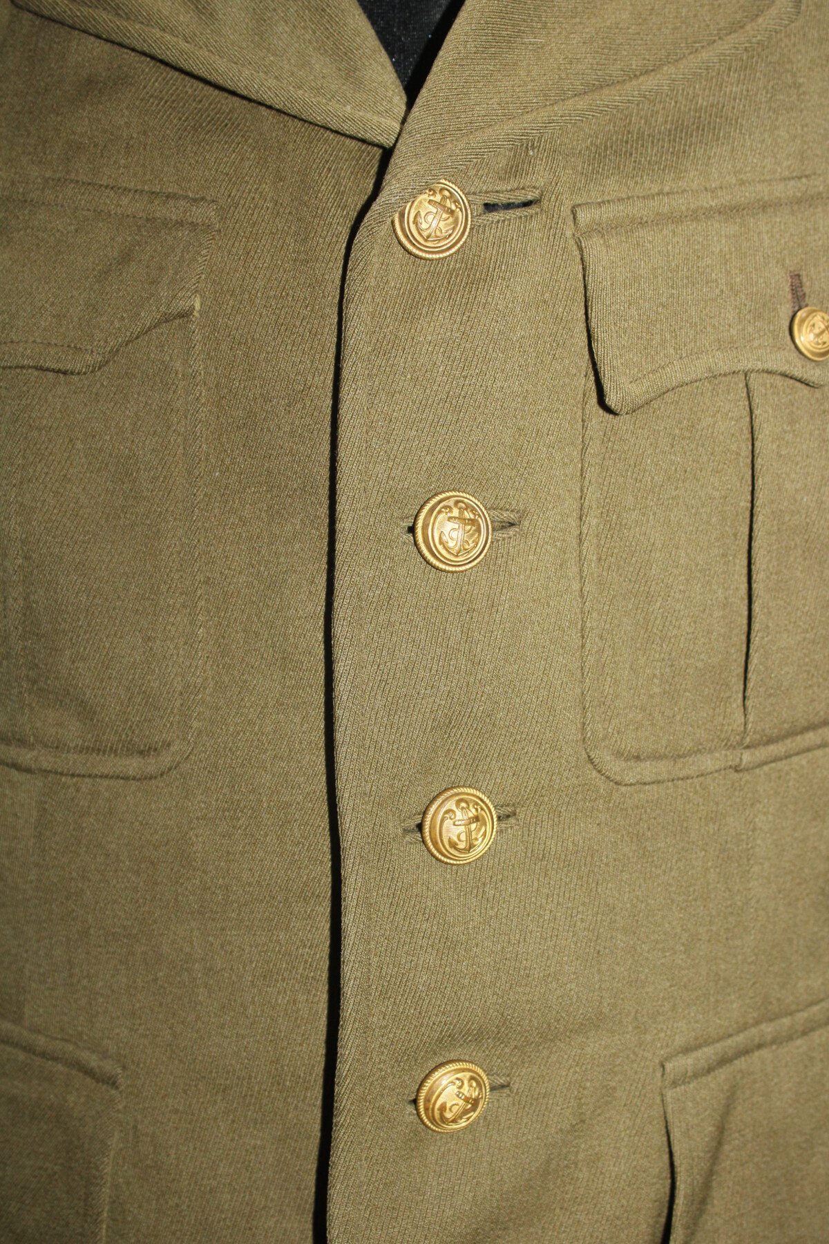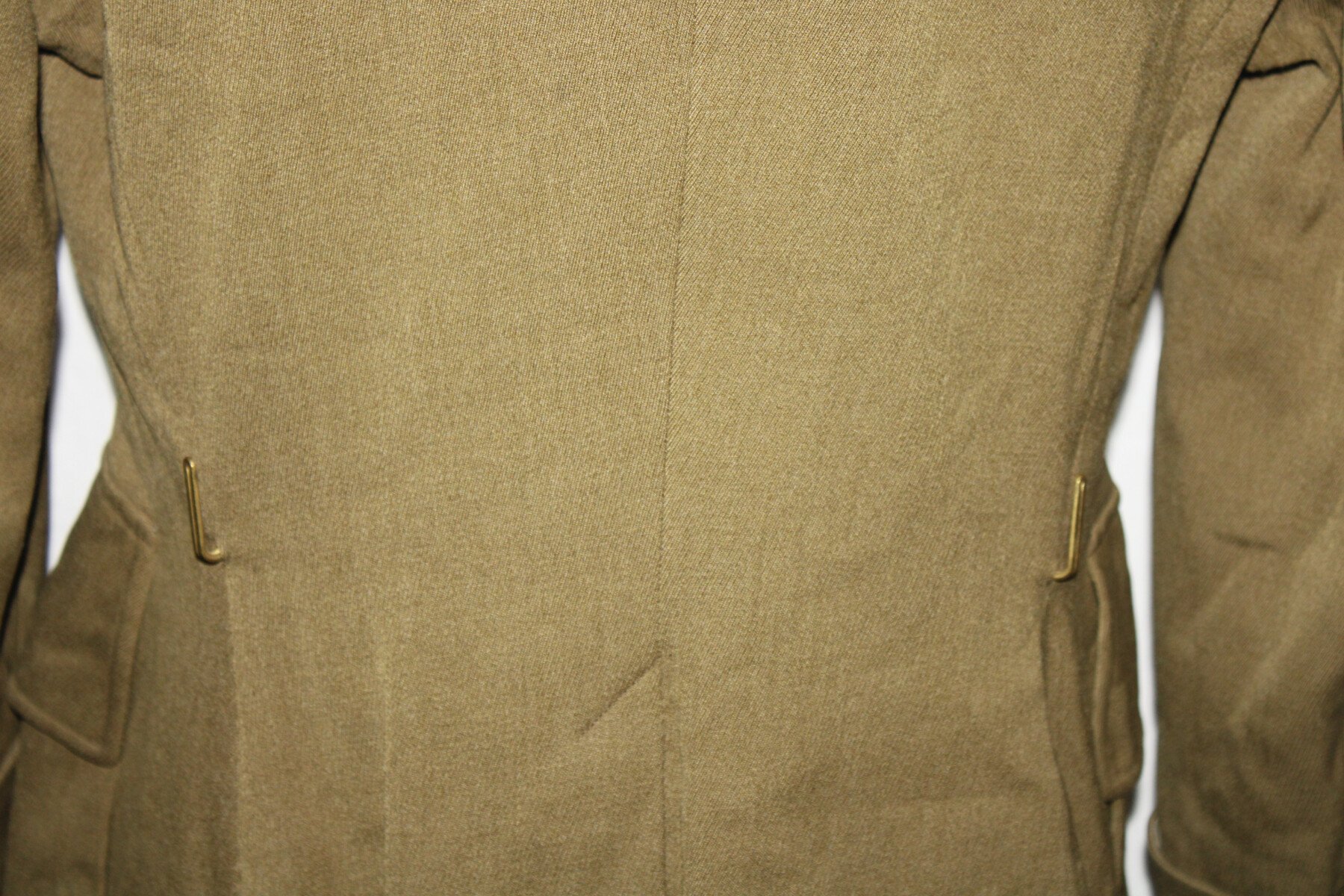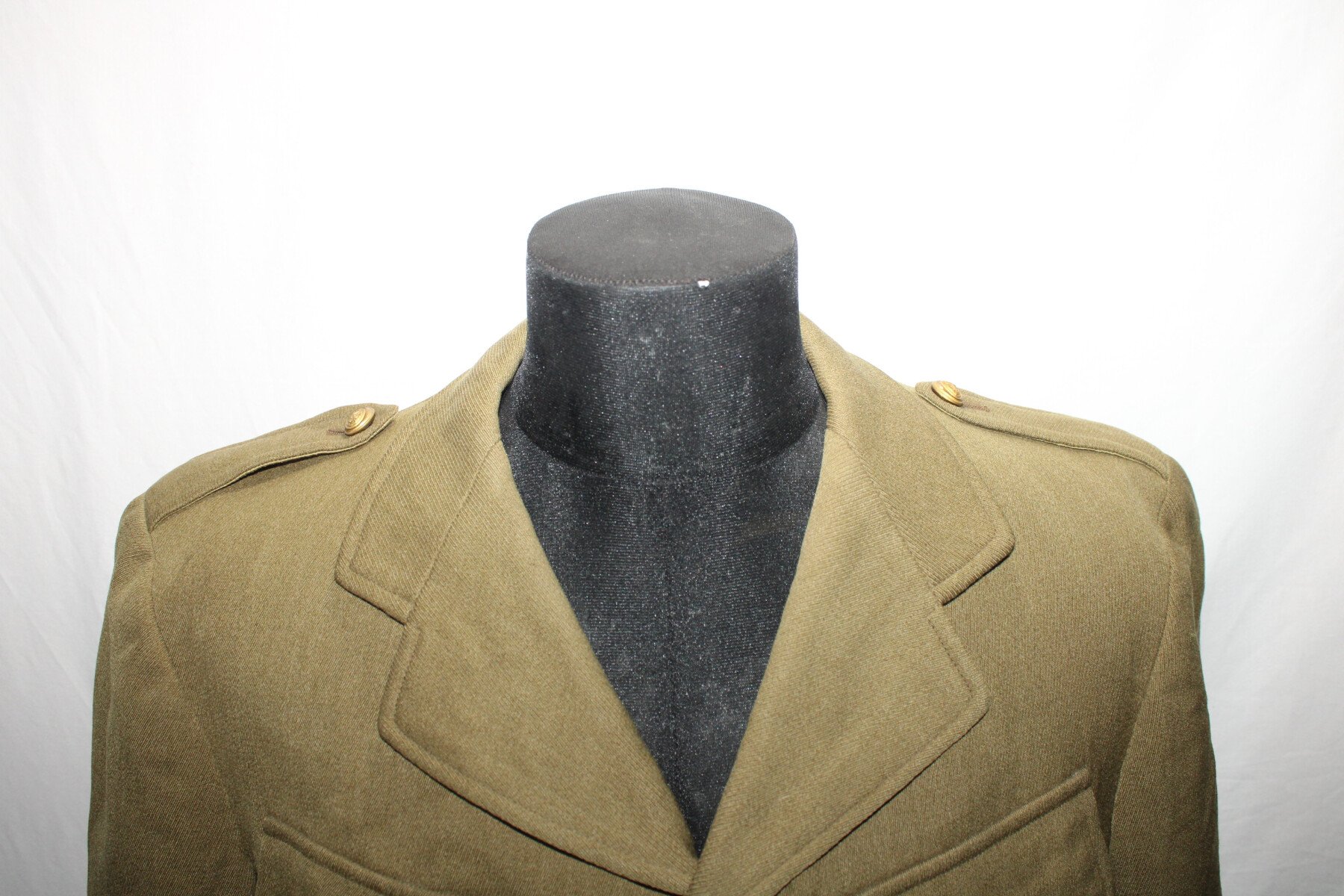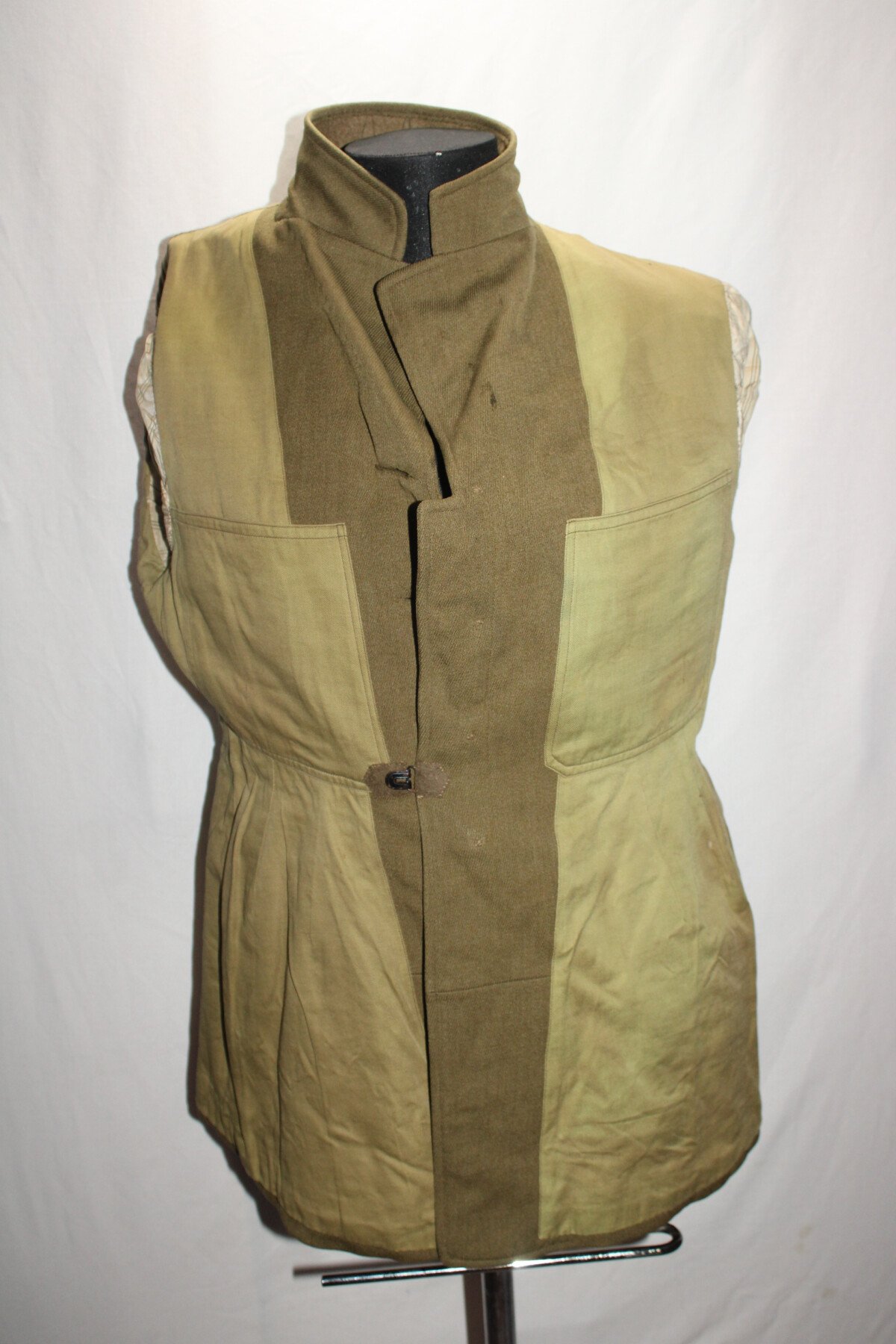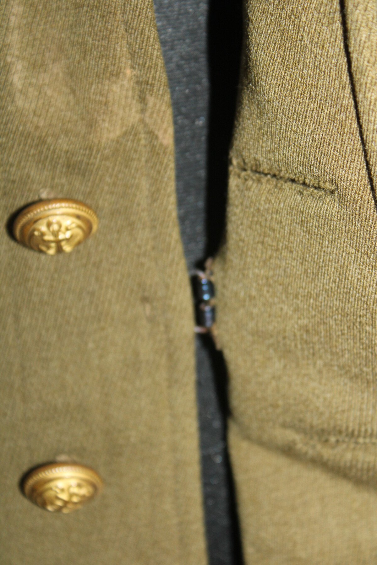 Vareuse modèle 39 pour officier, boutons d'armes aux couleurs de la Coloniale. Trous sur le bas des poches. Taille: largeur d'épaules 46cm à plat. Longueur de manche: 58 cm.