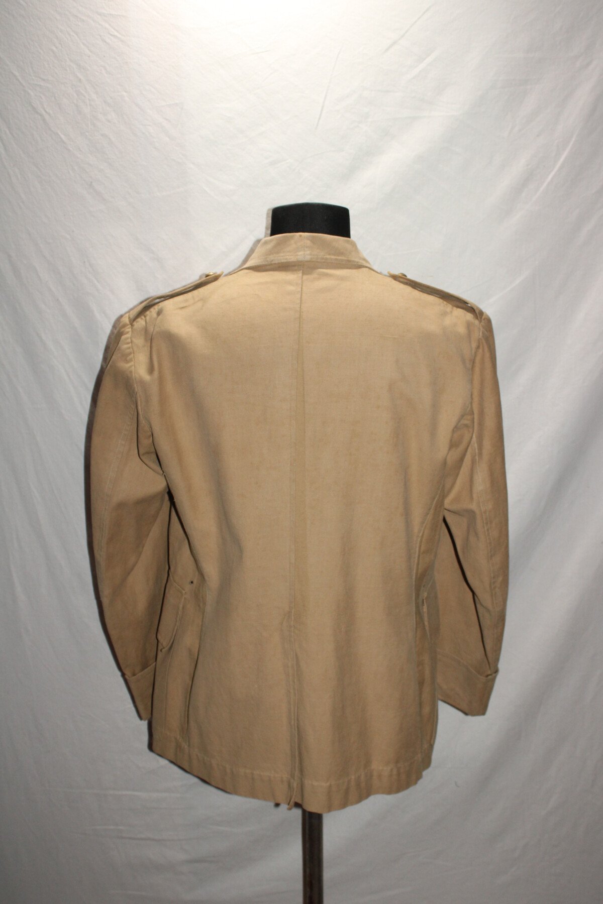 Vareuse en toile du modèle 38 de l'artillerie Colonial, boutons d'armes de l'artillerie Colonial. Patte de col rouge avec ancre en canetille. Bride pour les médailles. Pièce en bon état, des taches du coté droit, peu visible. Pas de tampon visible. Largeur d'épaules de coutures à coutures=44cm, longueur de manches= 60 cm, hauteur totale ( du bas du col au bas de la veste) =70 cm.