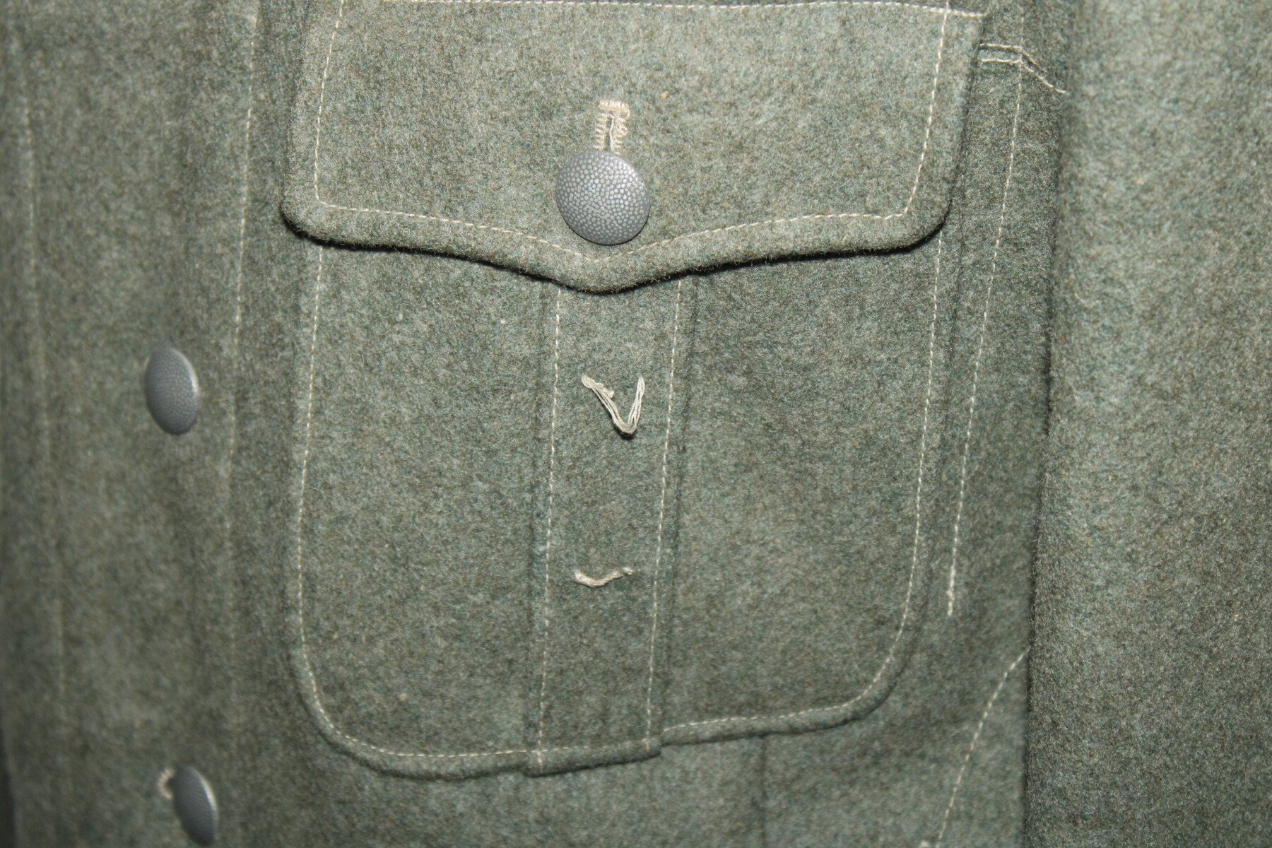 Veste modèle 36 montée en officier du régiment SS Hohenstaufen, comprenant pattes d'épaules SS officier, pattes de cols SS officier, aigle de bras officier, bande de bars tissée Bevo du régiment Hohenstaufen, sur la poche gauche des brides y sont pour le port d'un badge. Veste portée lors d'un tournage. Taille, Largeur D'épaule 49cm, longueur de manche 67cm.