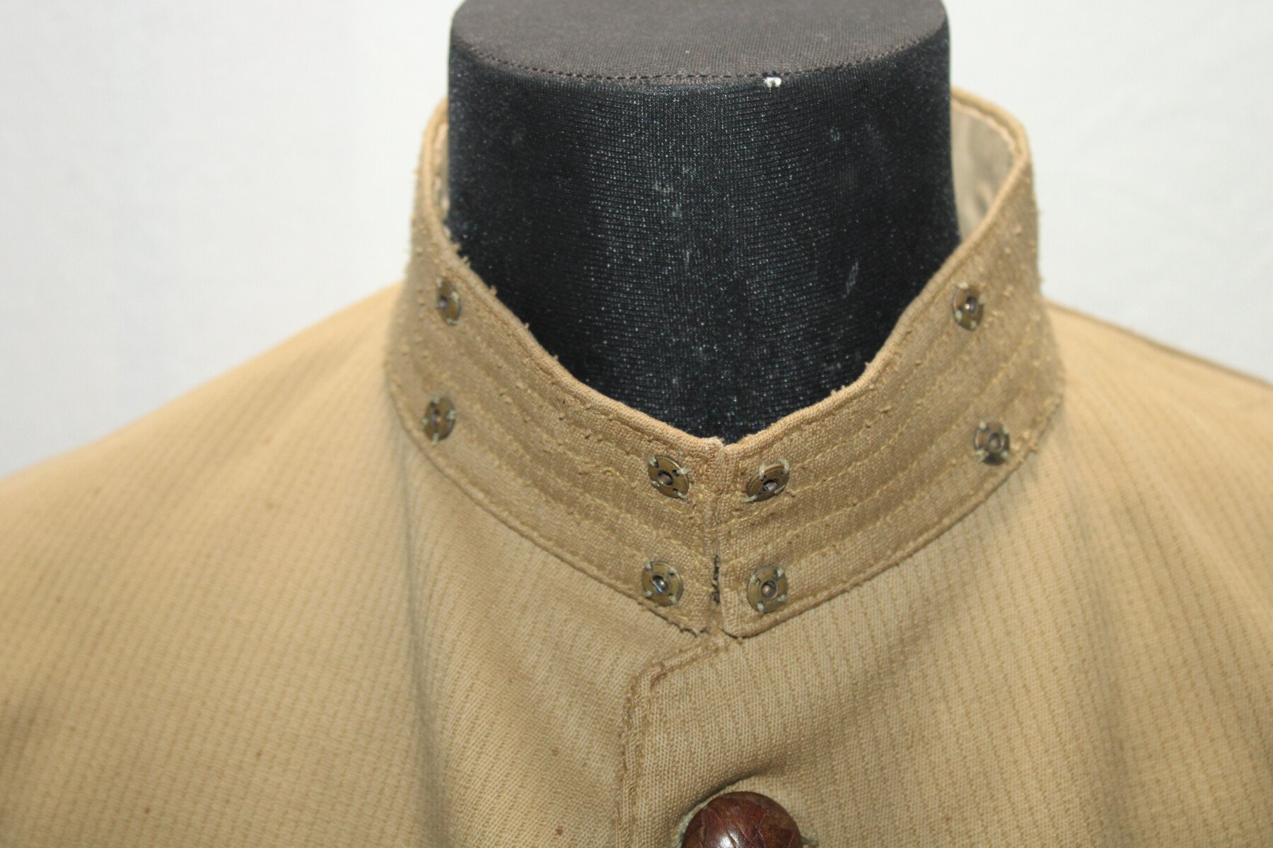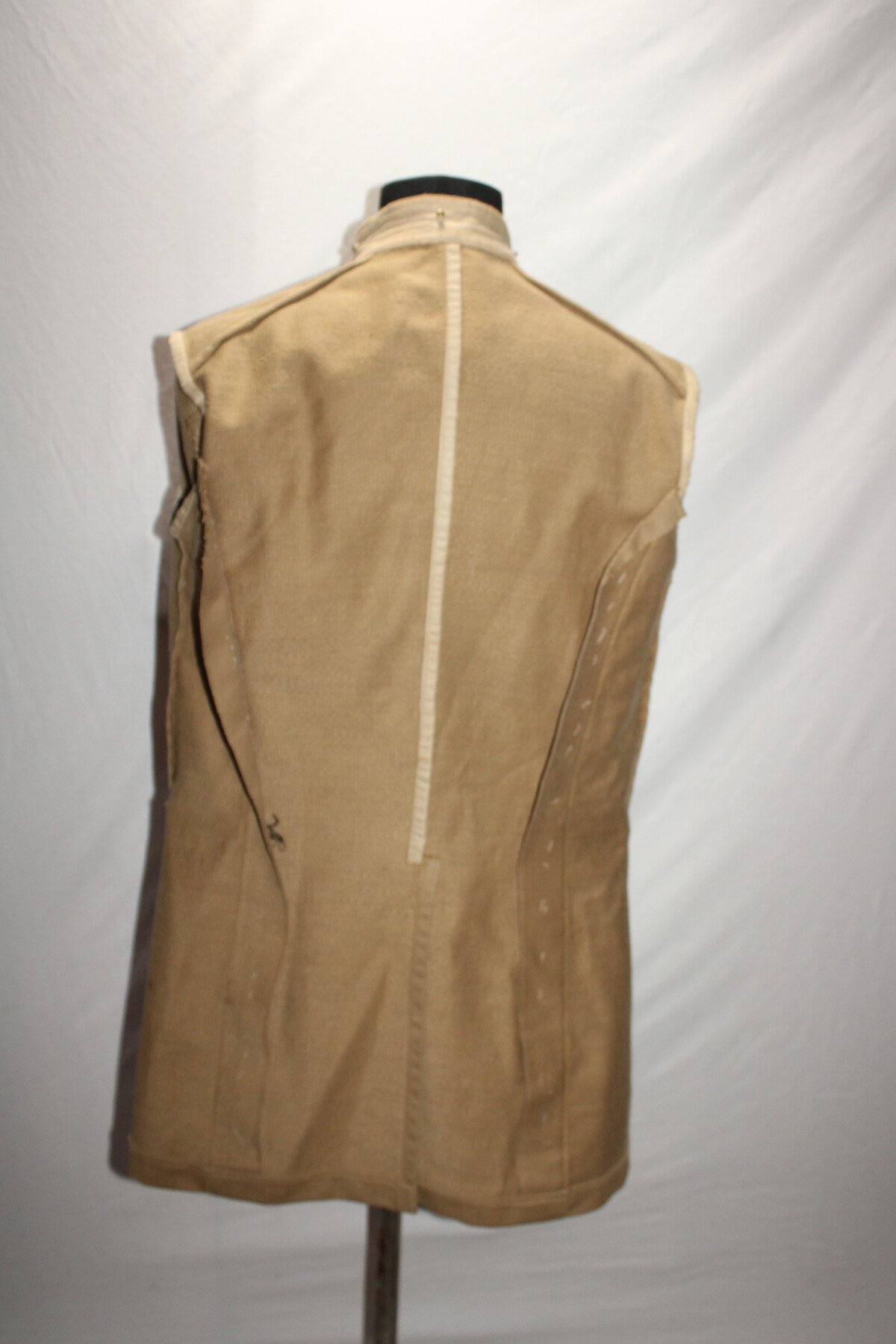Vareuse d'officiers sable en velours fin. Boutons amovible en cuir. Boutons pressions pour les pattes de cols. Ruban de la légion d'honneur cousue. Grade de capitaine en bas de manche. Une trace noire dans le dos. Taille: largeur d'épaules 43 cm à plat. Longueur de manche: 63 cm. Hauteur totale: 84 cm.