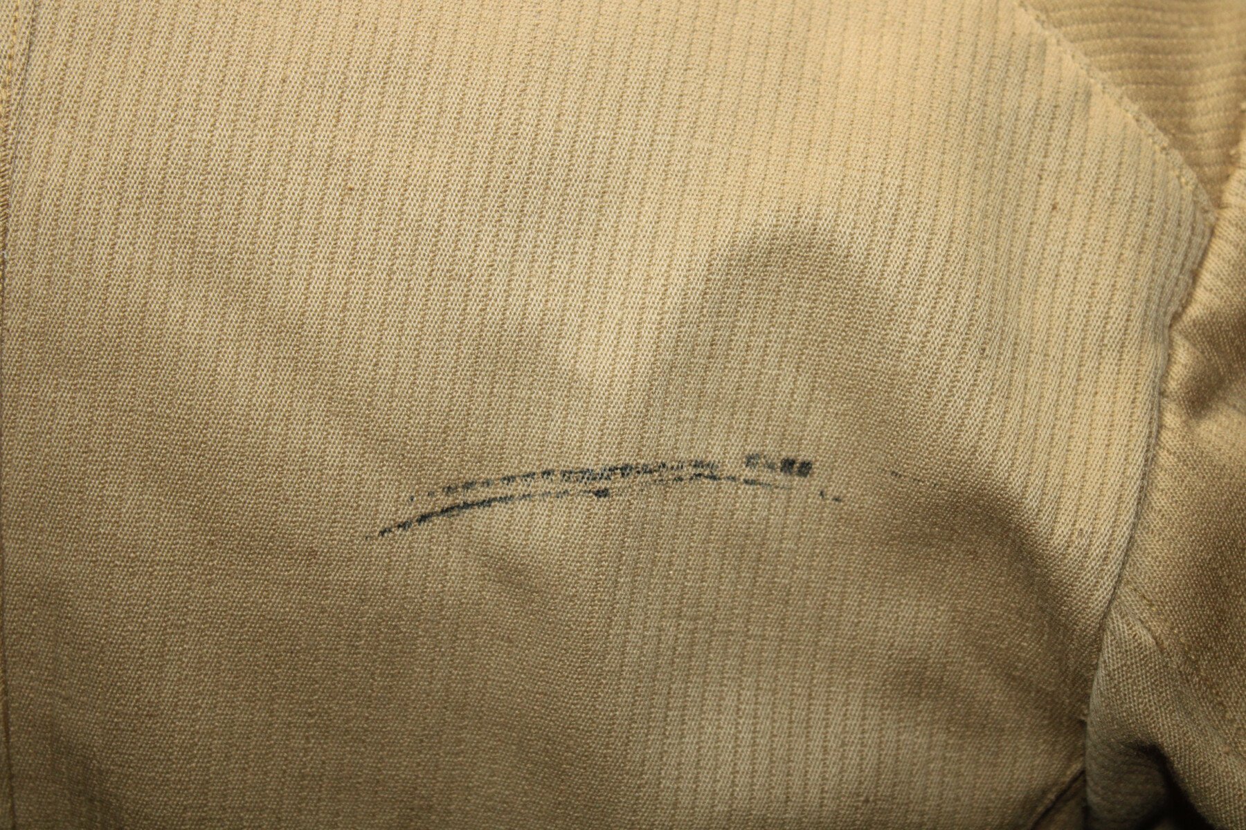 Vareuse d'officiers sable en velours fin. Boutons amovible en cuir. Boutons pressions pour les pattes de cols. Ruban de la légion d'honneur cousue. Grade de capitaine en bas de manche. Une trace...