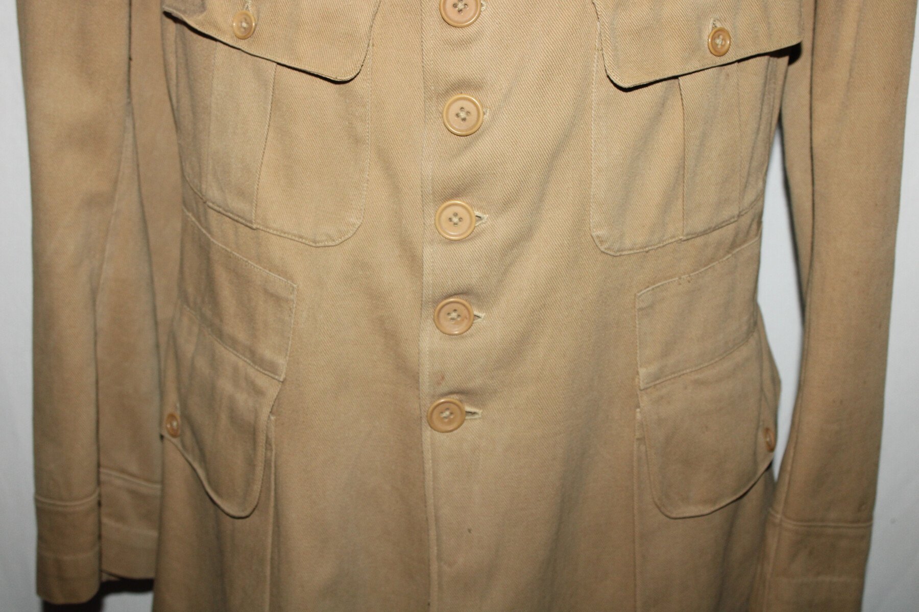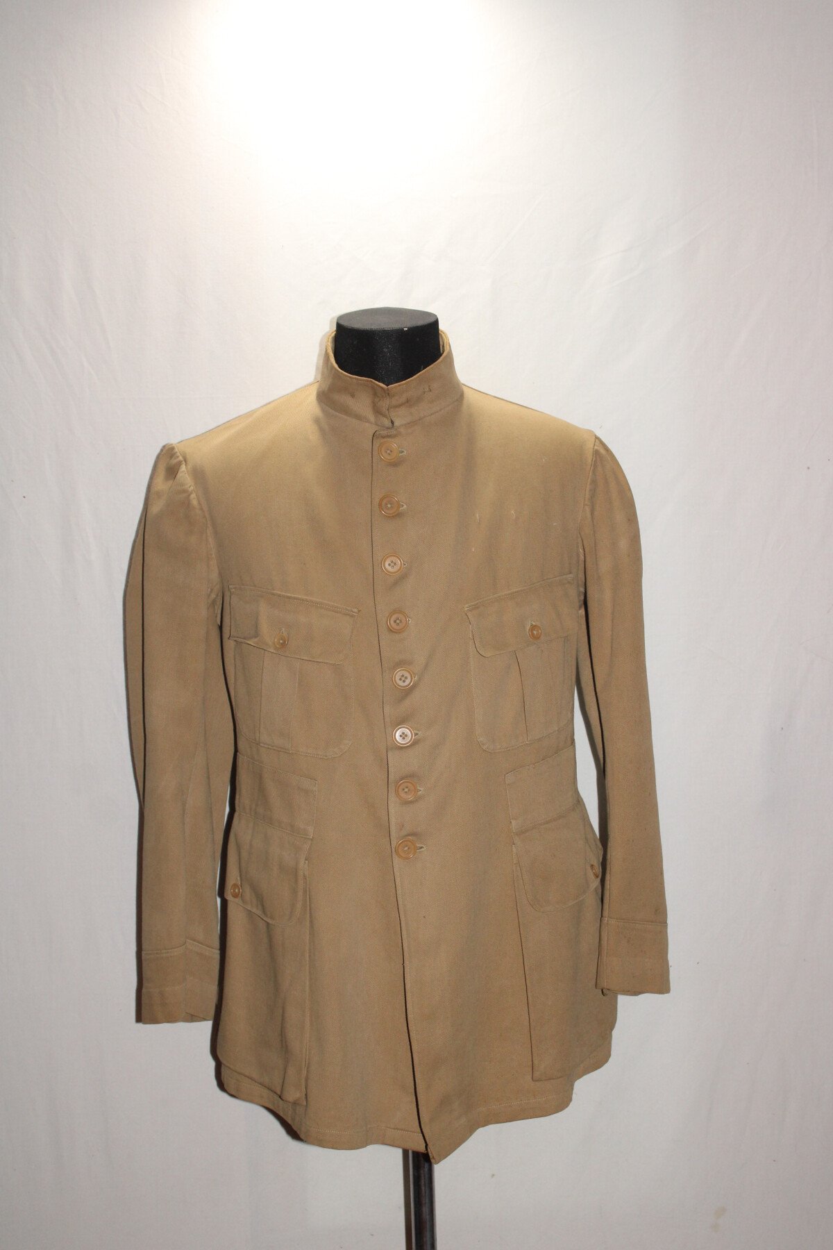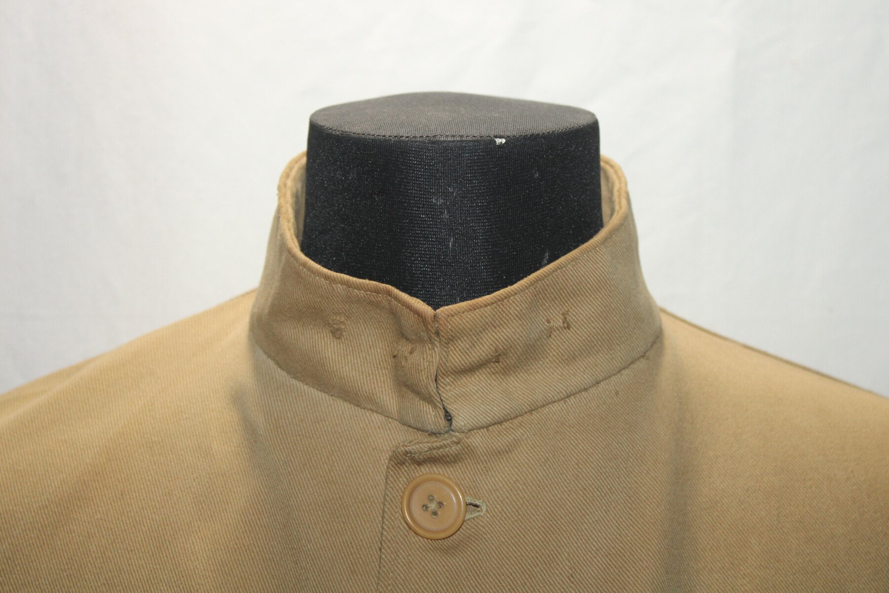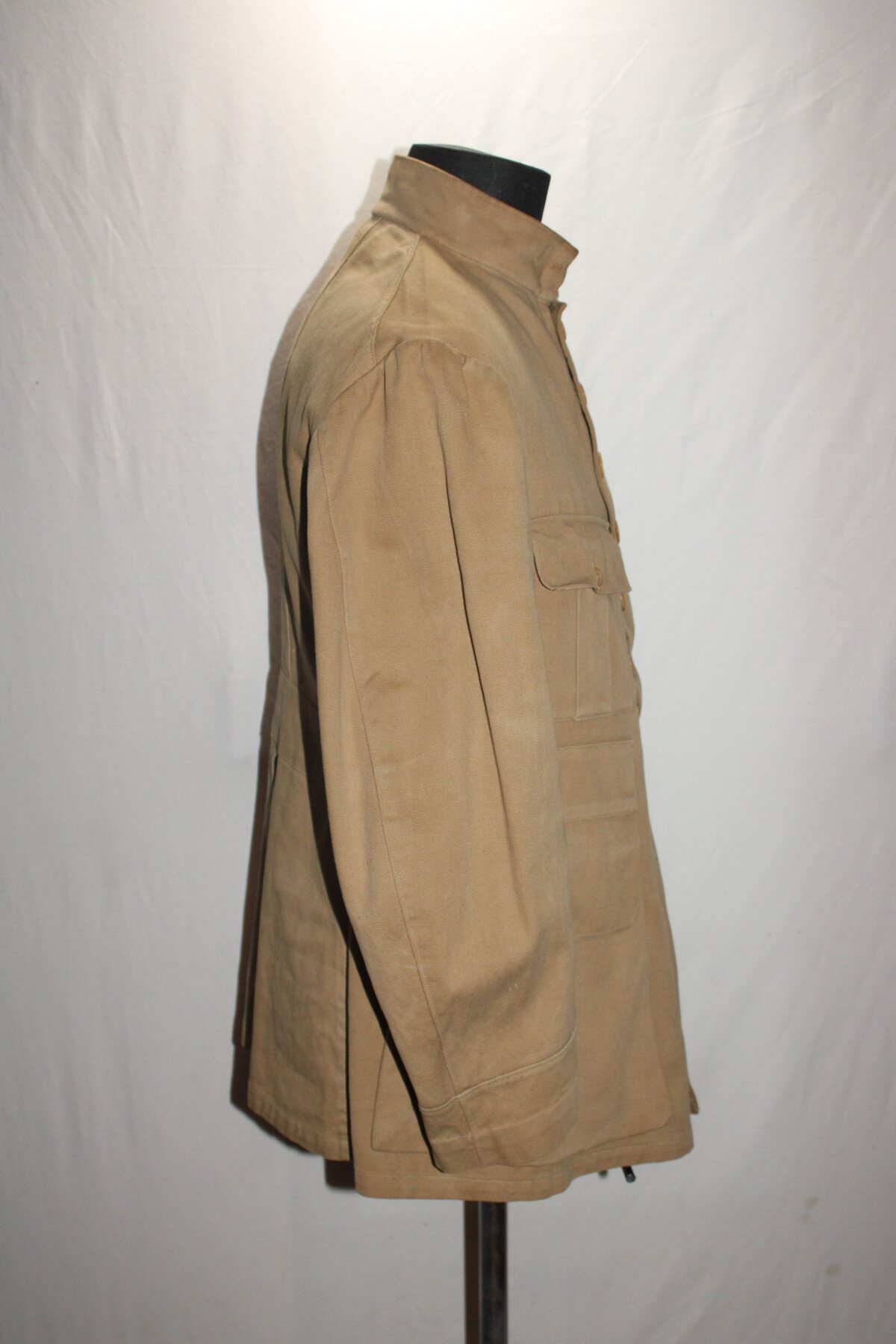 Vareuse en toile pour officier de la coloniale début 1900. à col demi saxe, une rangée de 8 boutons. pas de tampon de date ou autre. Taille: largeur d'épaules 44,5 cm à plat. Longueur de manche:...