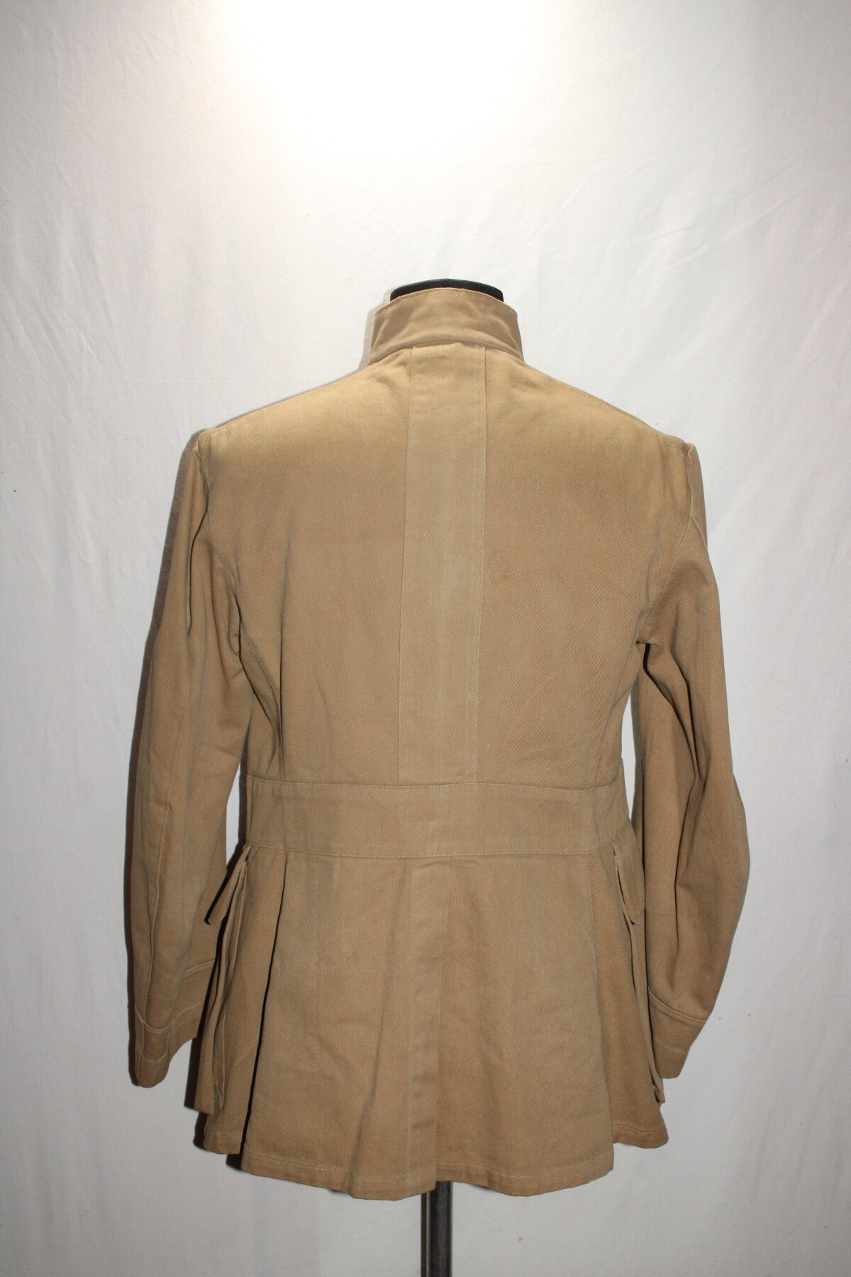 Vareuse en toile pour officier de la coloniale début 1900. à col demi saxe, une rangée de 8 boutons. pas de tampon de date ou autre. Taille: largeur d'épaules 44,5 cm à plat. Longueur de manche: 60 cm. Hauteur totale: 76 cm. présence de brides pour une décoration à attache à boules.