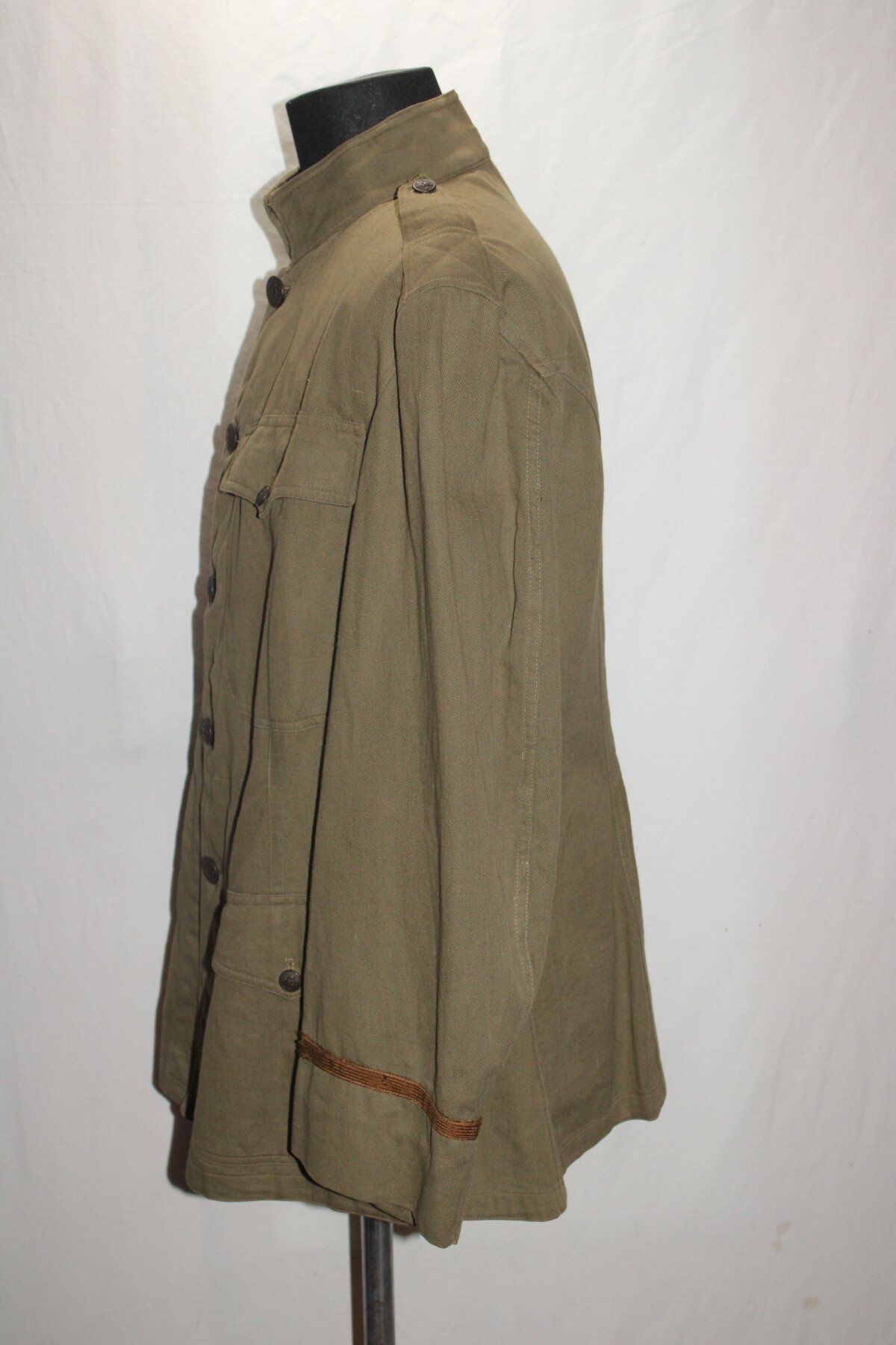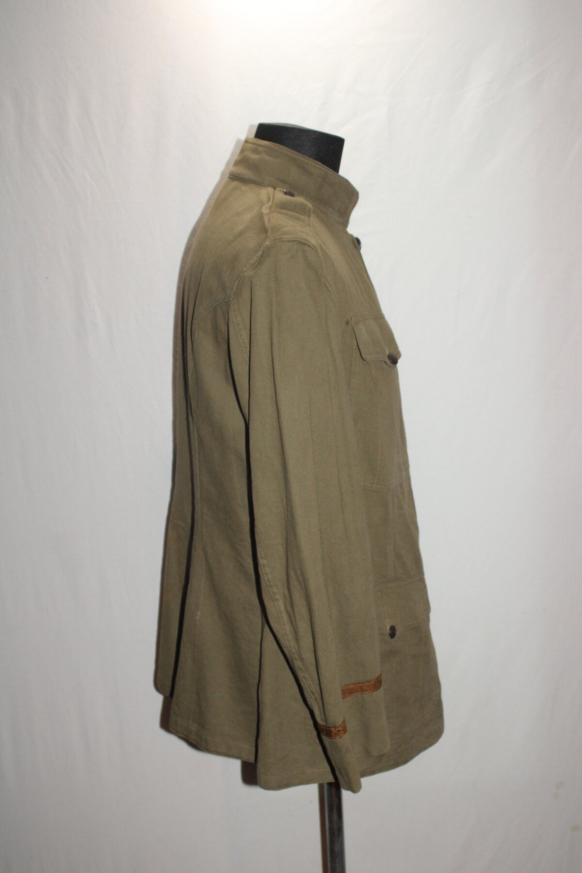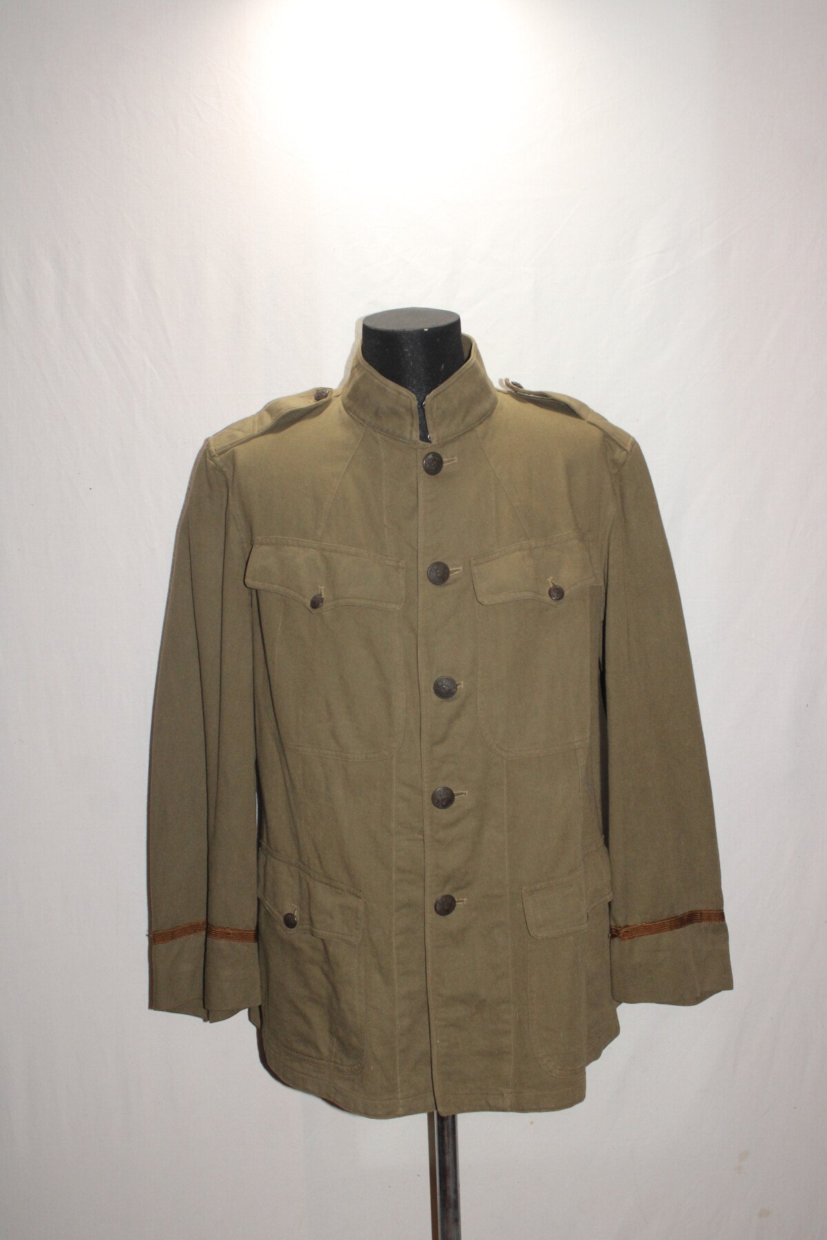 Vareuse officier toile kaki modèle 1910, pas d'étiquette de fabrication visible. Tout les boutons sont présents. Portée mais bel état. Largeur d'épaule = 46 cm, longueur de manche= 62 cm. Hauteur totale=76cm.