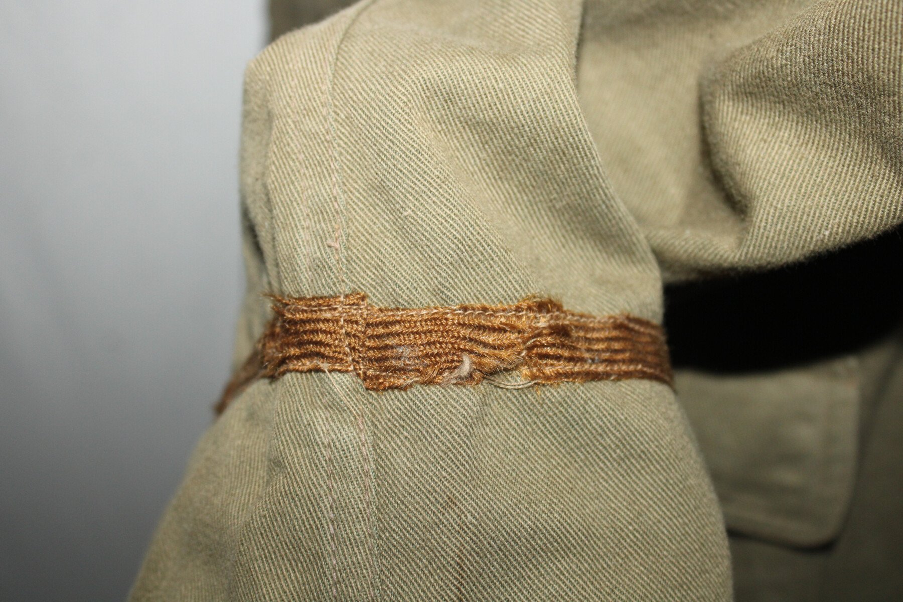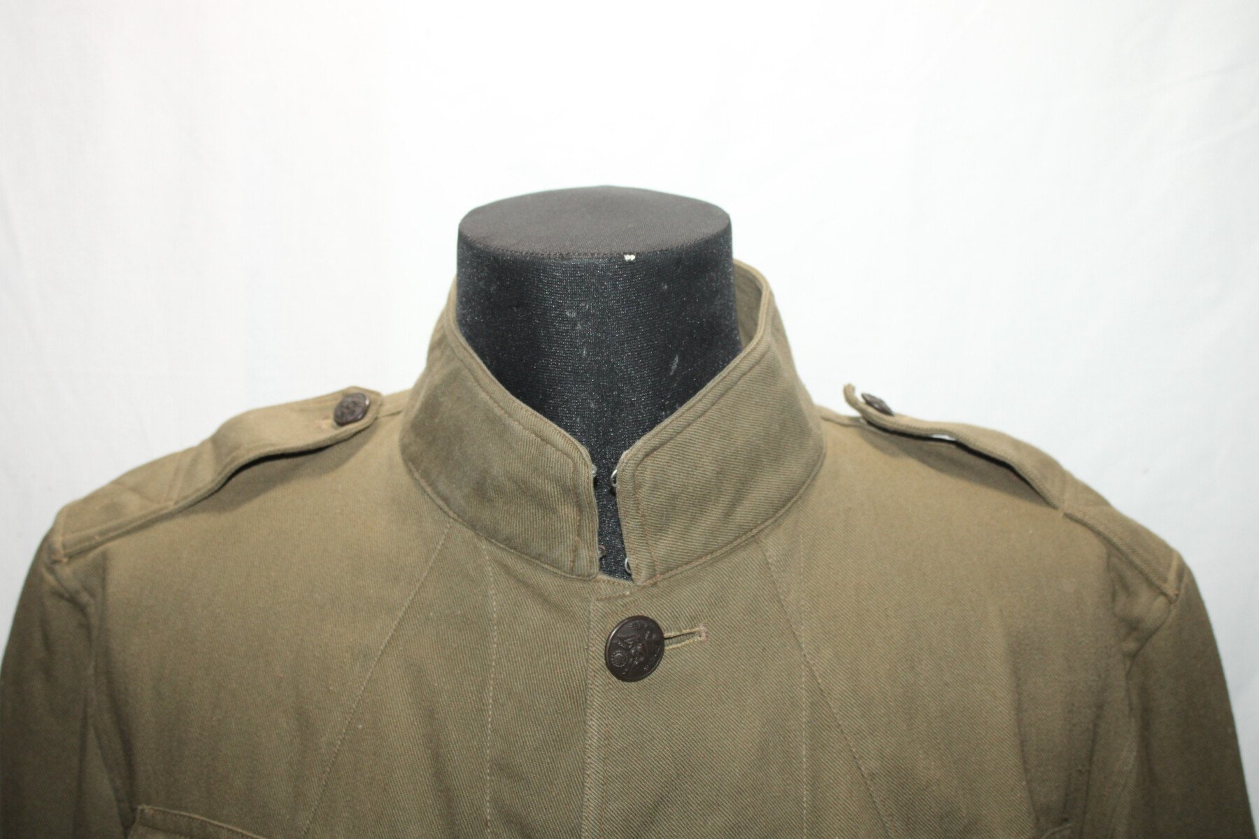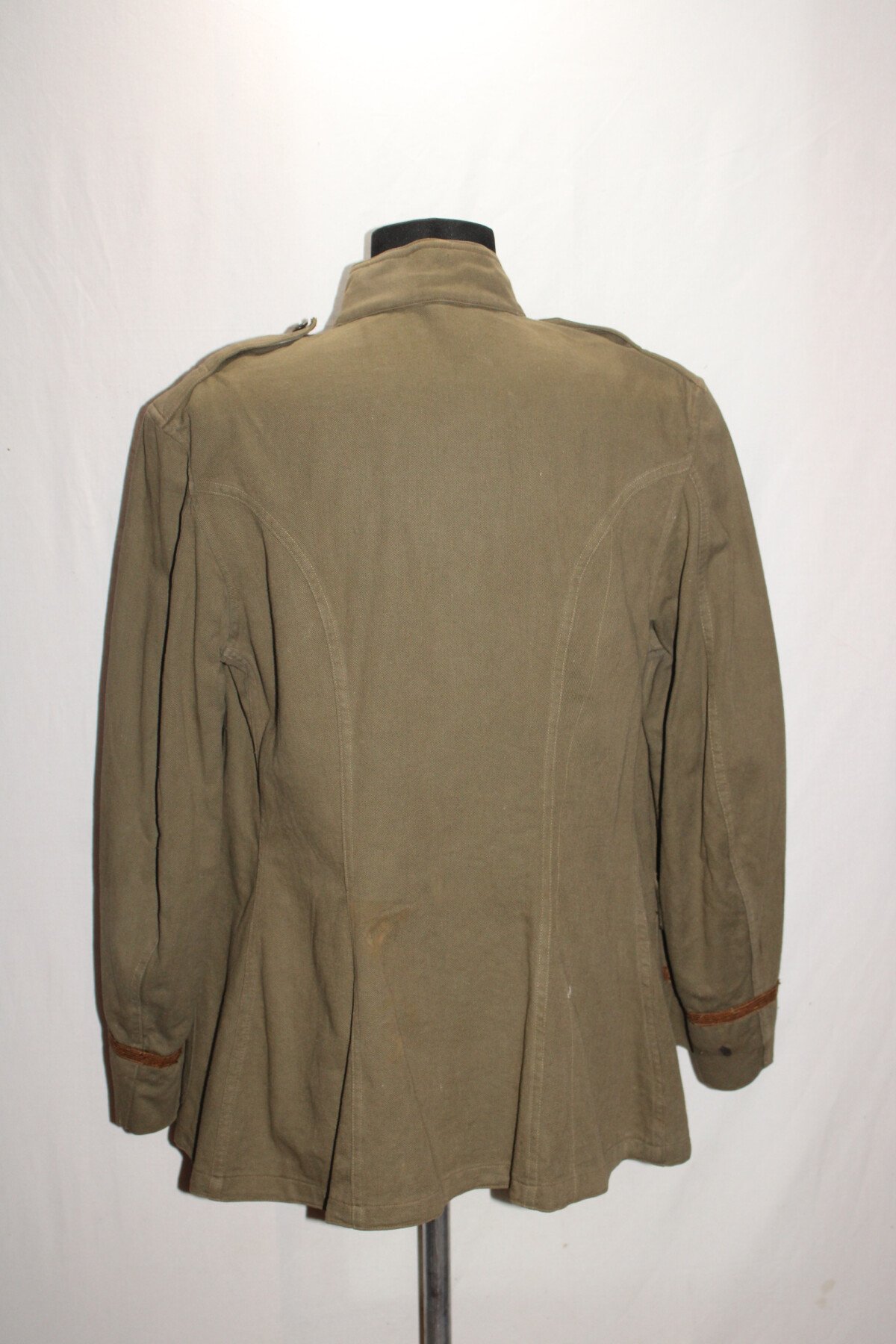 Vareuse officier toile kaki modèle 1910, pas d'étiquette de fabrication visible. Tout les boutons sont présents. Portée mais bel état. Largeur d'épaule = 46 cm, longueur de manche= 62 cm. Hauteur totale=76cm.