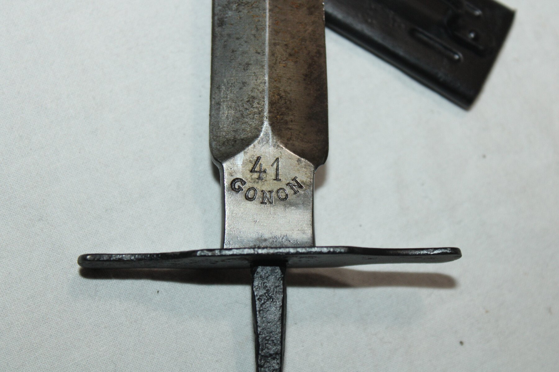 Couteau de tranchée modèle 1916 fabrication 41 Gonon a Paris. Poigné absente. Toute les pièces sont présente pour une restauration. L'ensemble et repeint en noir. Pointe du fourreau tordu.