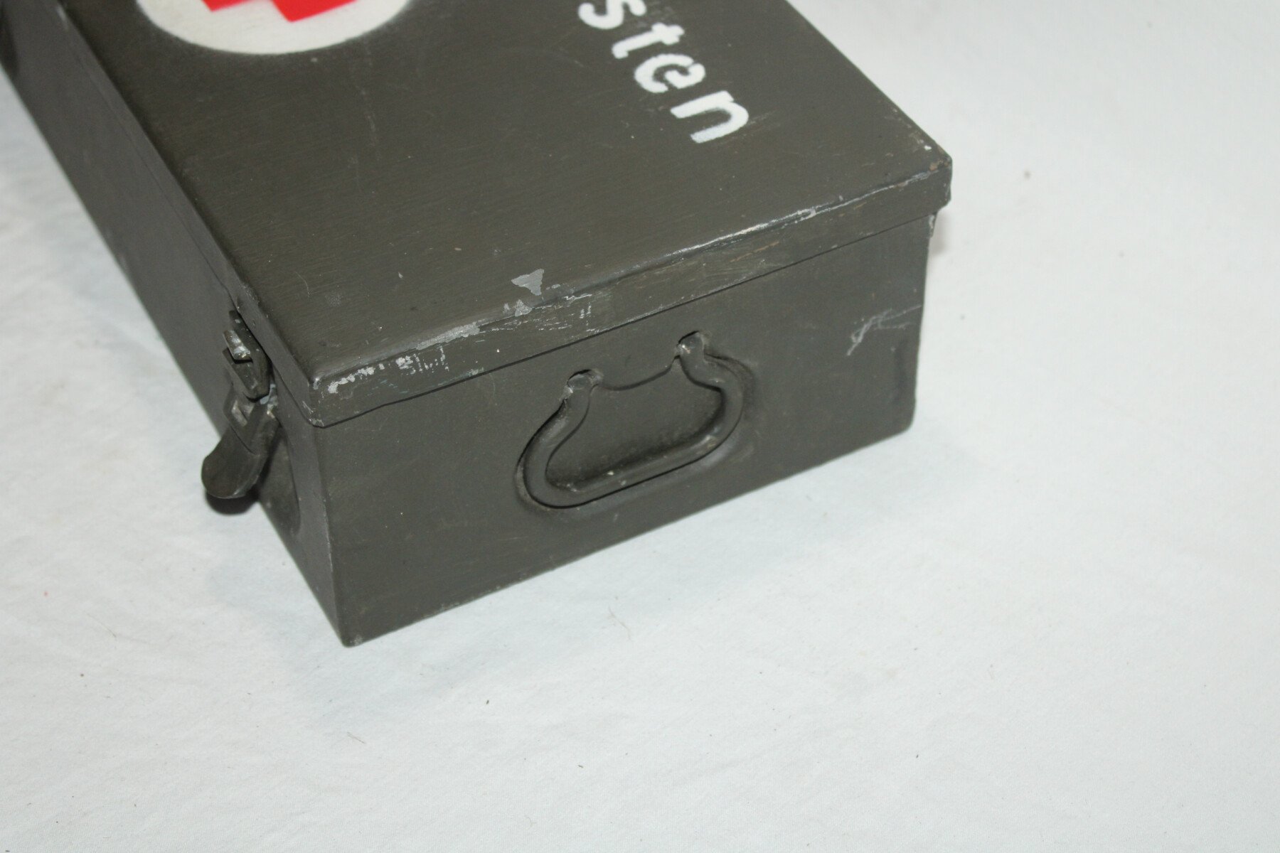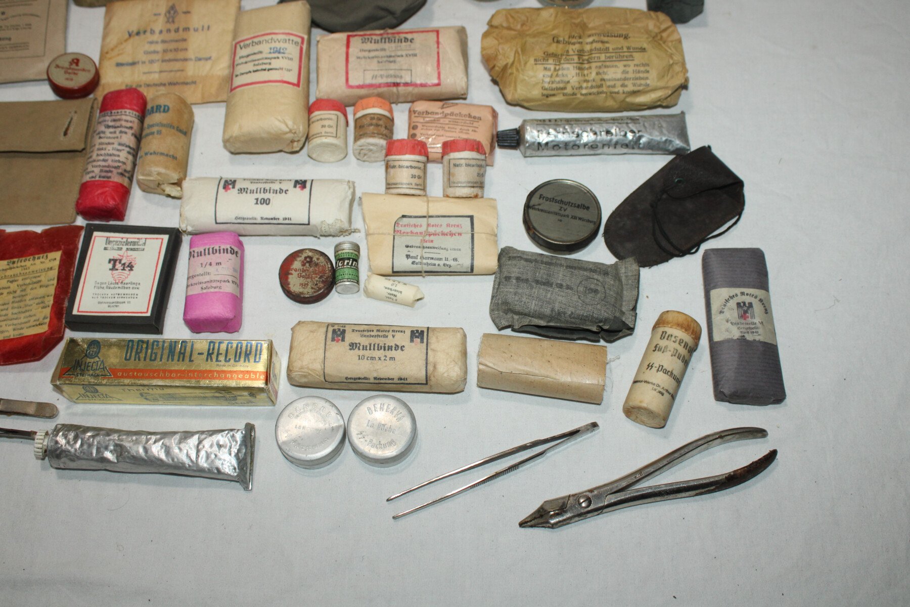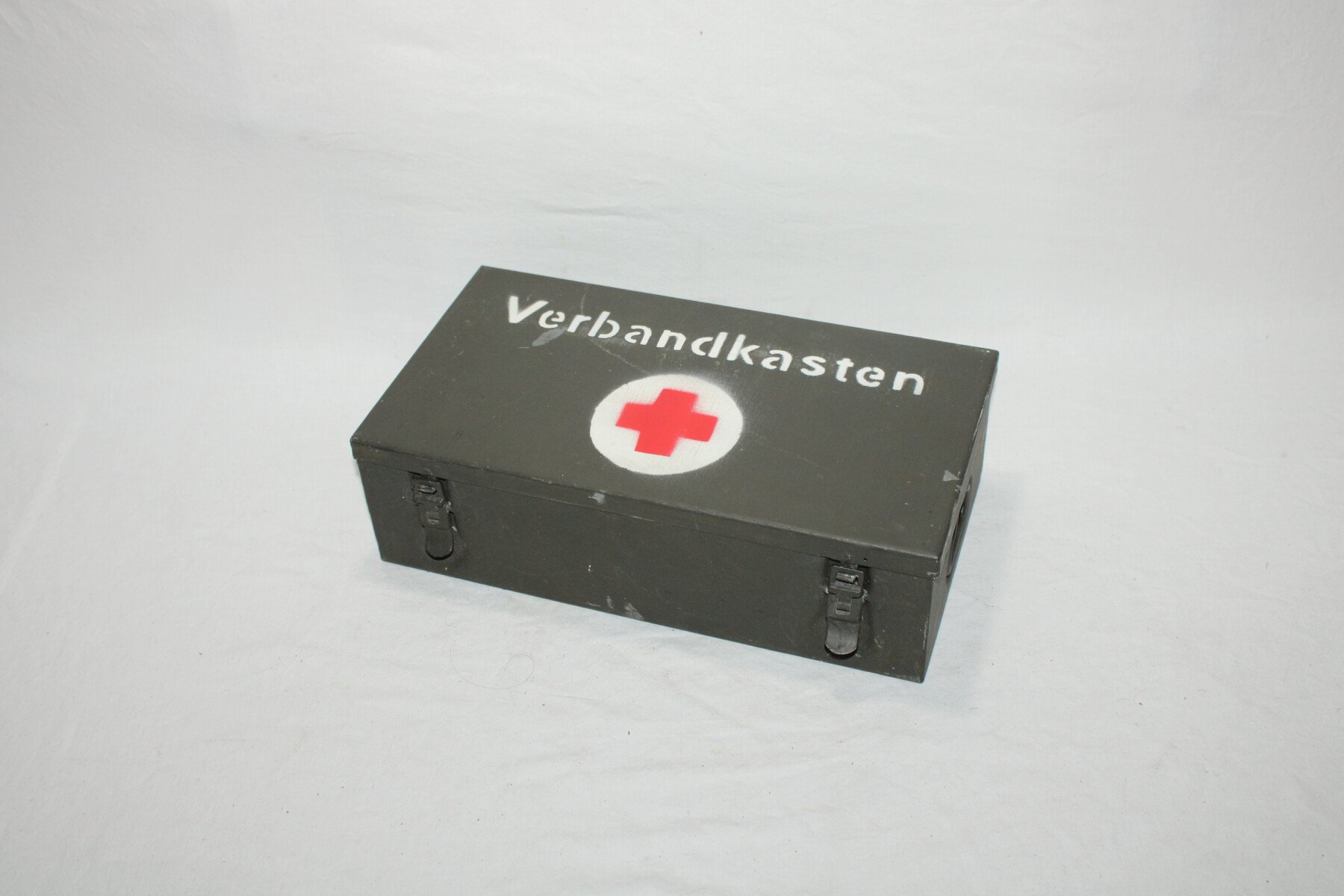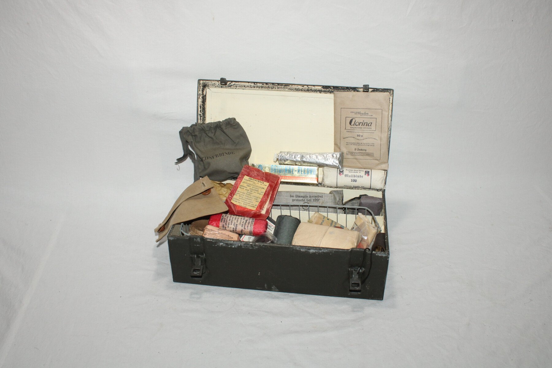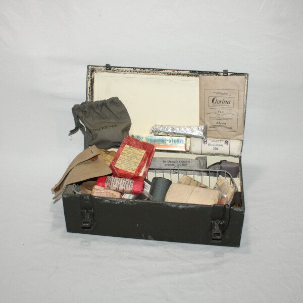 Boite de premier secours Verbandkasten. Caisse repeinte et marquage refait. Plus de 40 objets à l'intérieur, bandages, boites, instruments, attèle. Certains articles en reproduction.