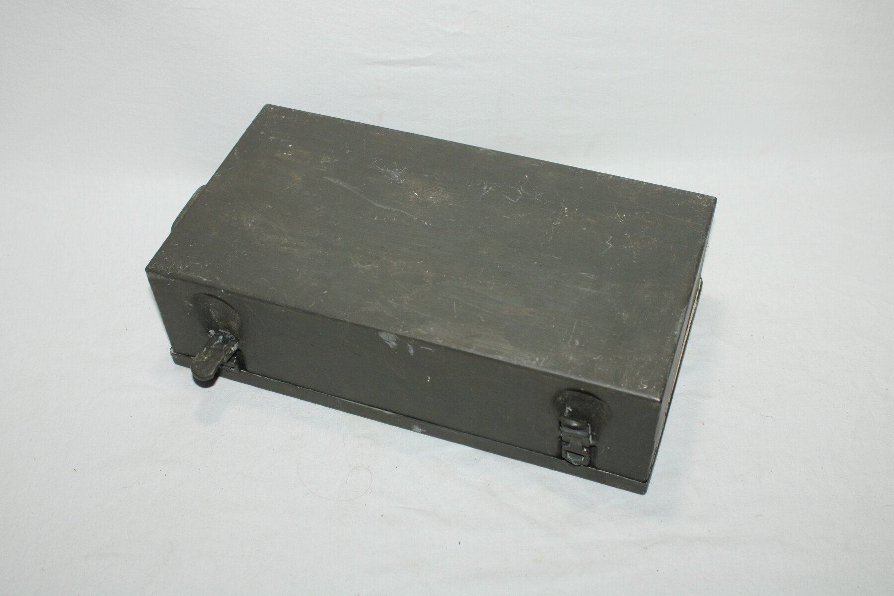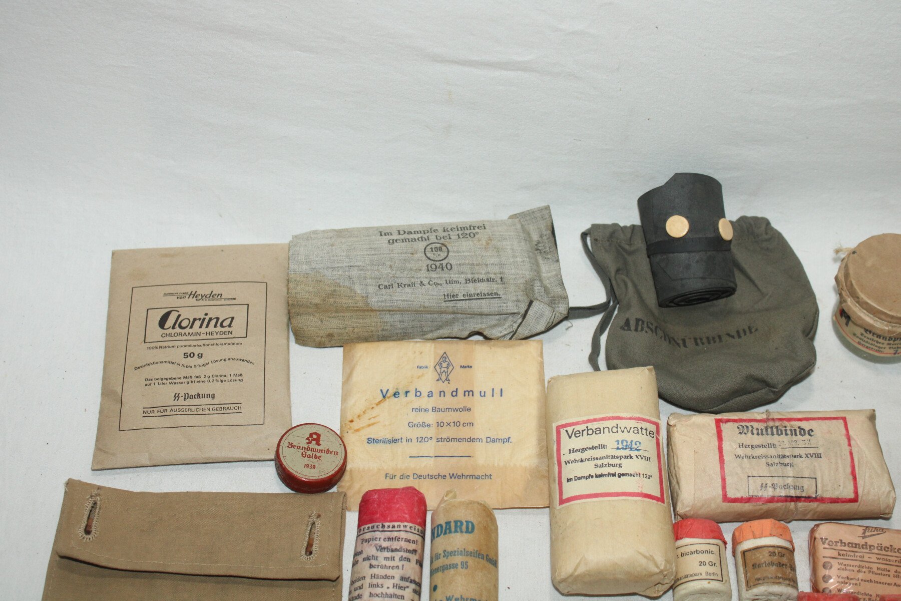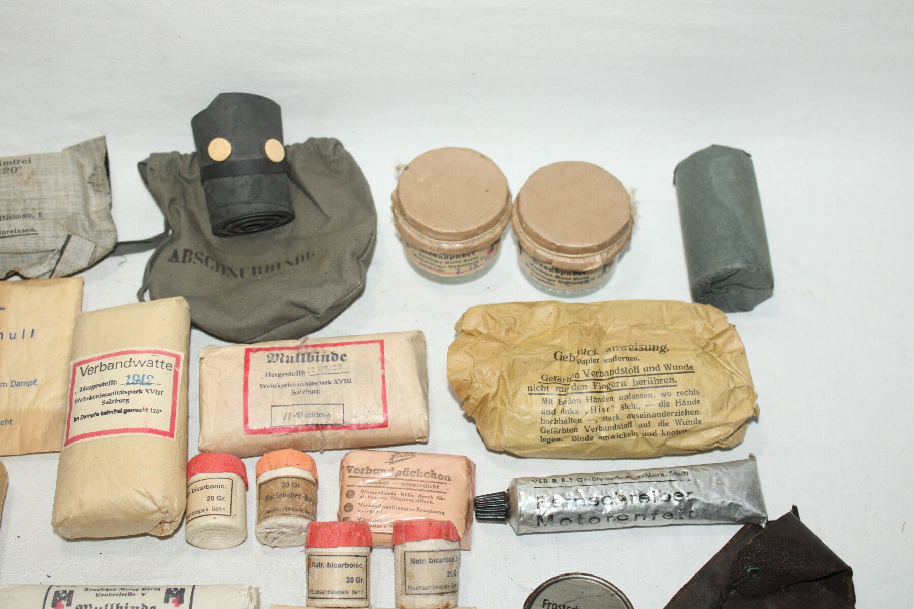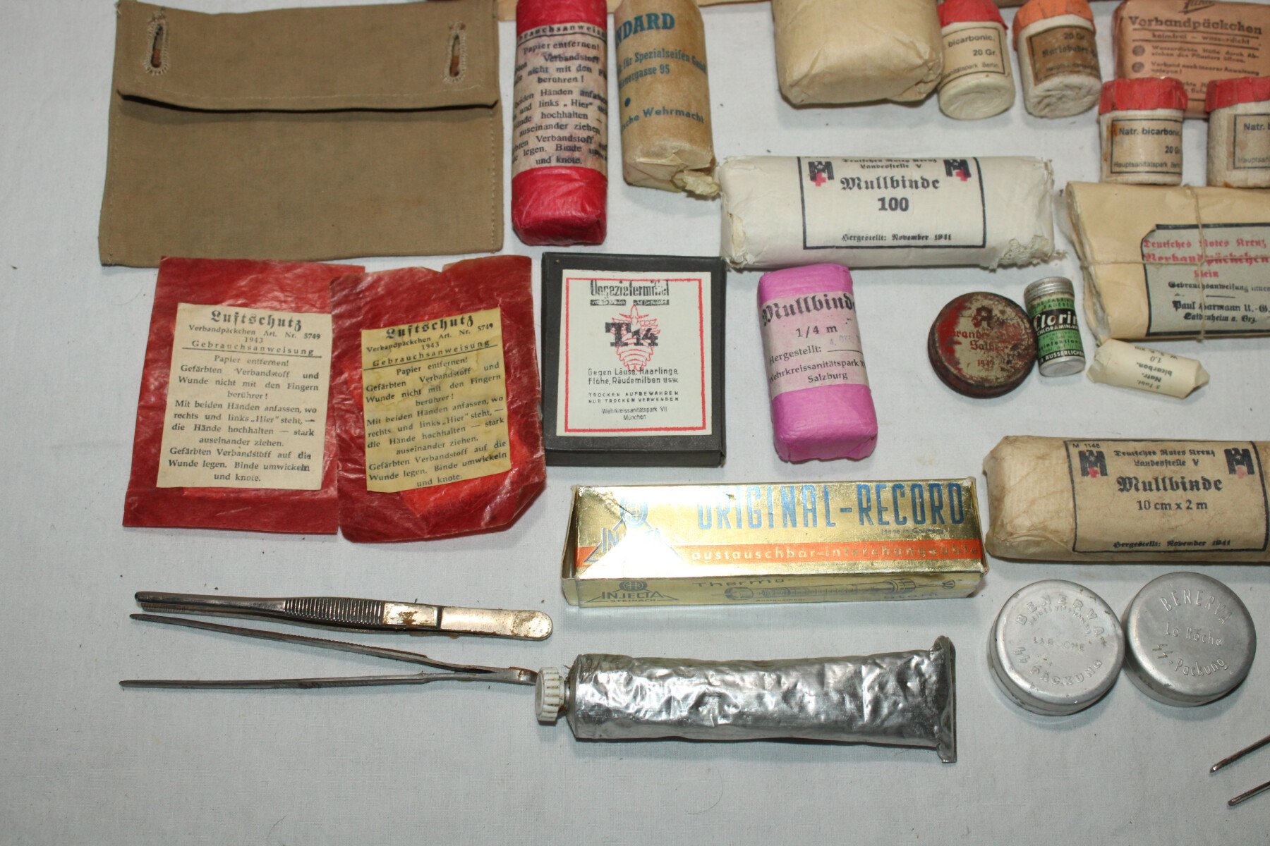 Boite de premier secours Verbandkasten. Caisse repeinte et marquage refait. Plus de 40 objets à l'intérieur, bandages, boites, instruments, attèle. Certains articles en reproduction.