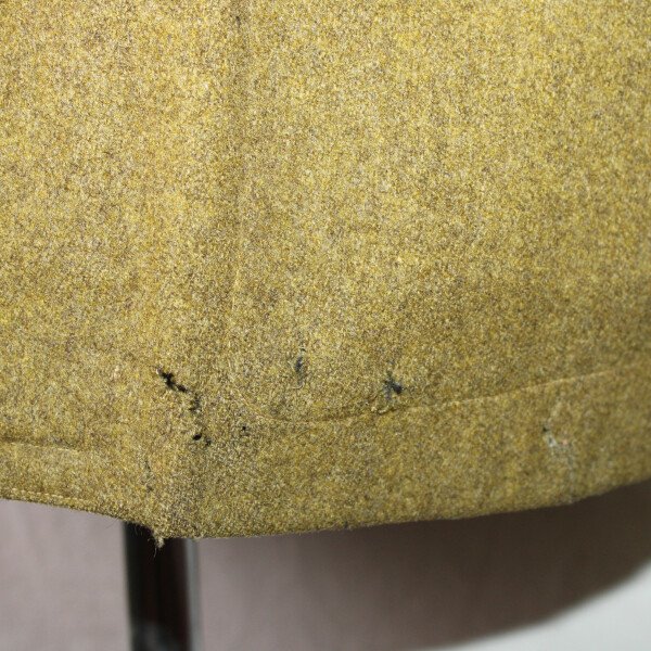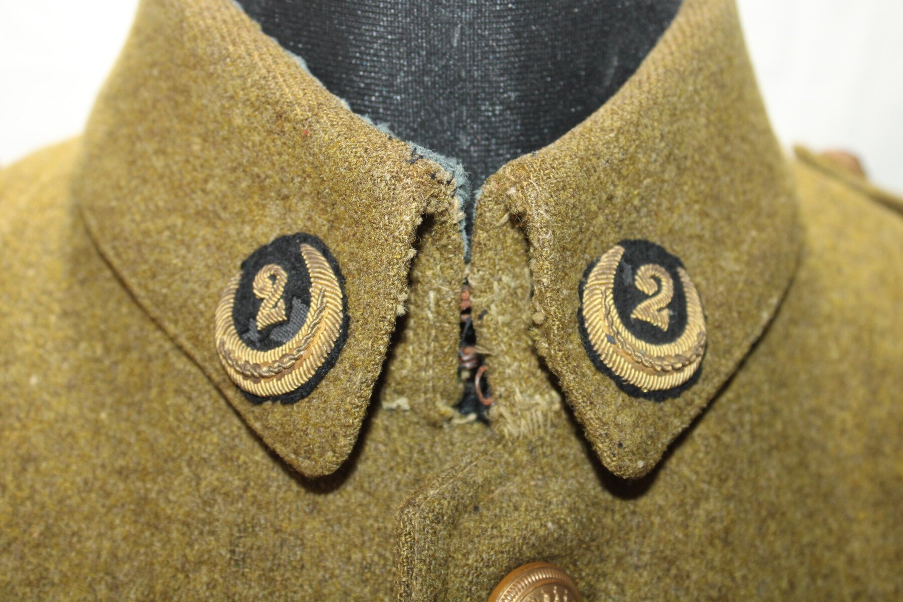 Veste en drap kaki type officier. Boutons dorés a grenade. Galons en bas des manches remontés ainsi que les insignes de col. Plusieurs trous notamment en bas de la veste. Tampons de costumier....