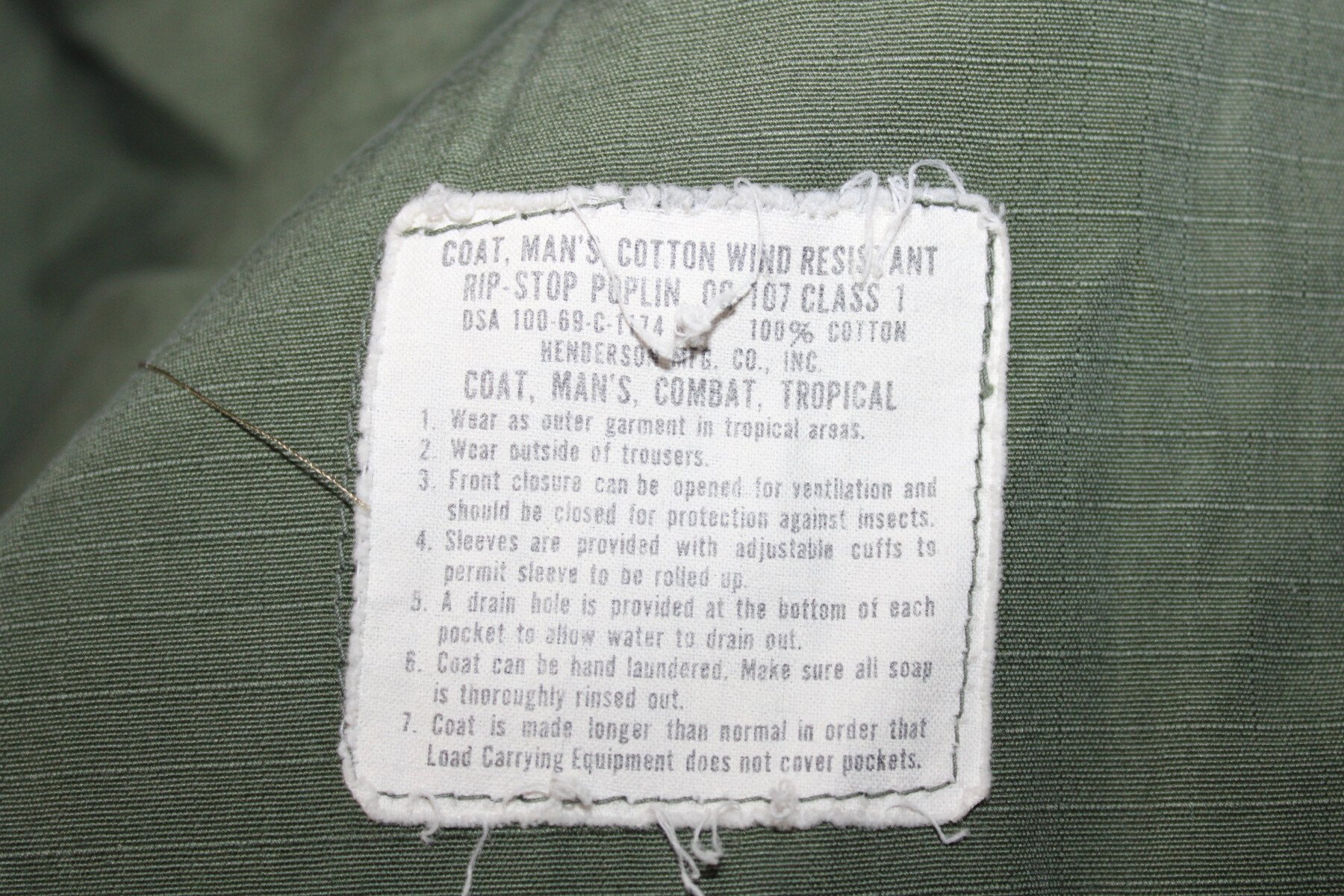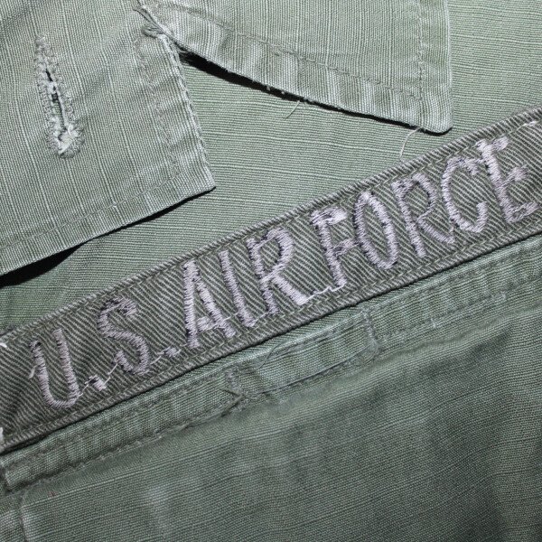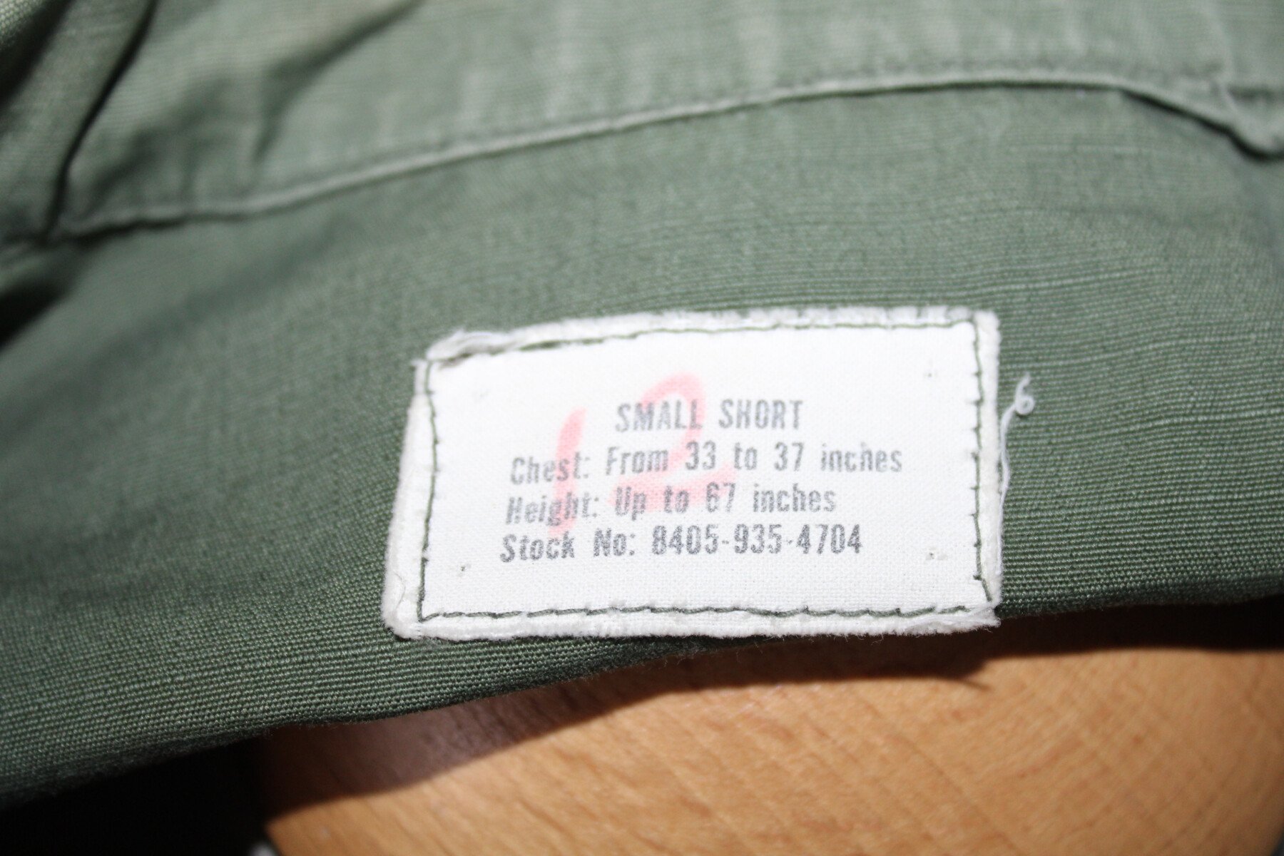 Veste OG 107, rip stop popline class 1, manche retaillé. Bel état général, daté 1969, taille Small short. Bande patronymique brodée de l'US air force.