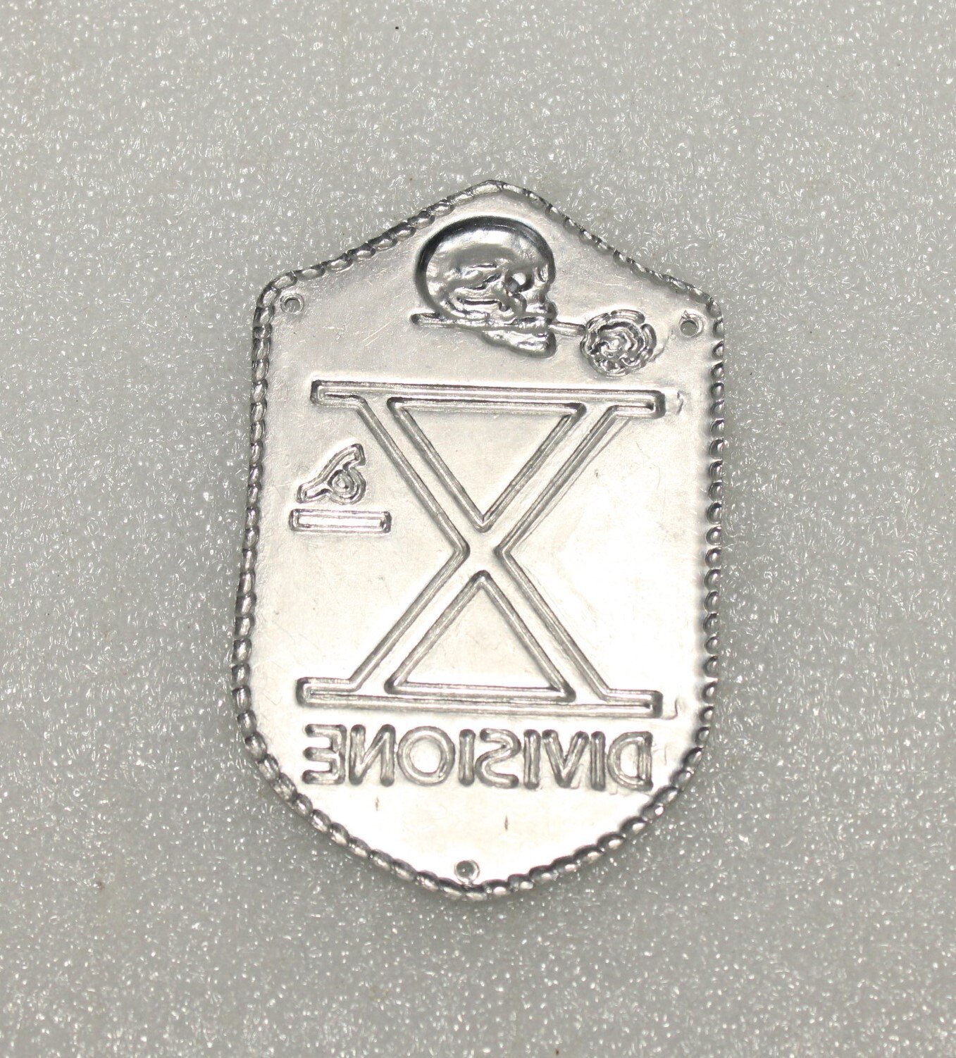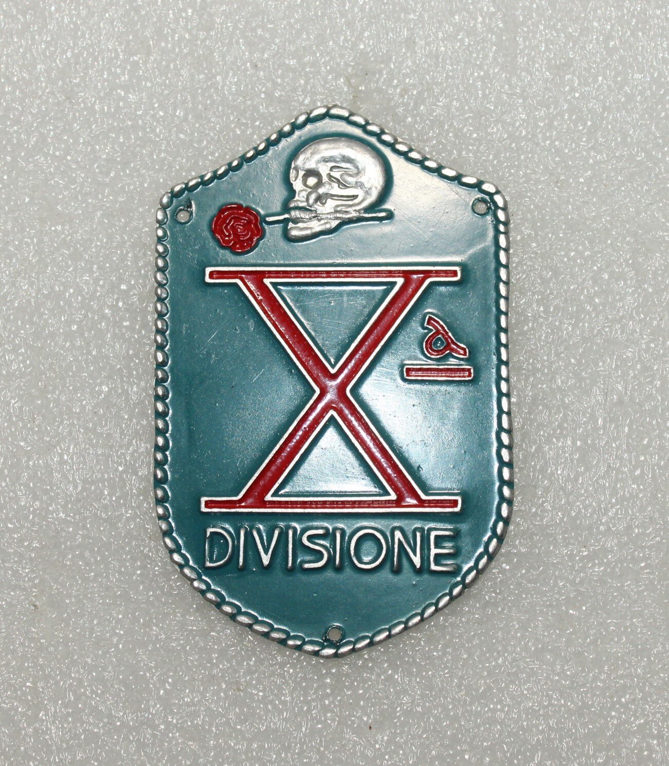 Bouclier de la Division de nageur de combat Italienne X MAS , une variante portant l'inscription « Divisione » au lieu de « Flottiglia ». Fabriqué en métal émaillé, il était porté par les unités RSI de la Dixième Division.
